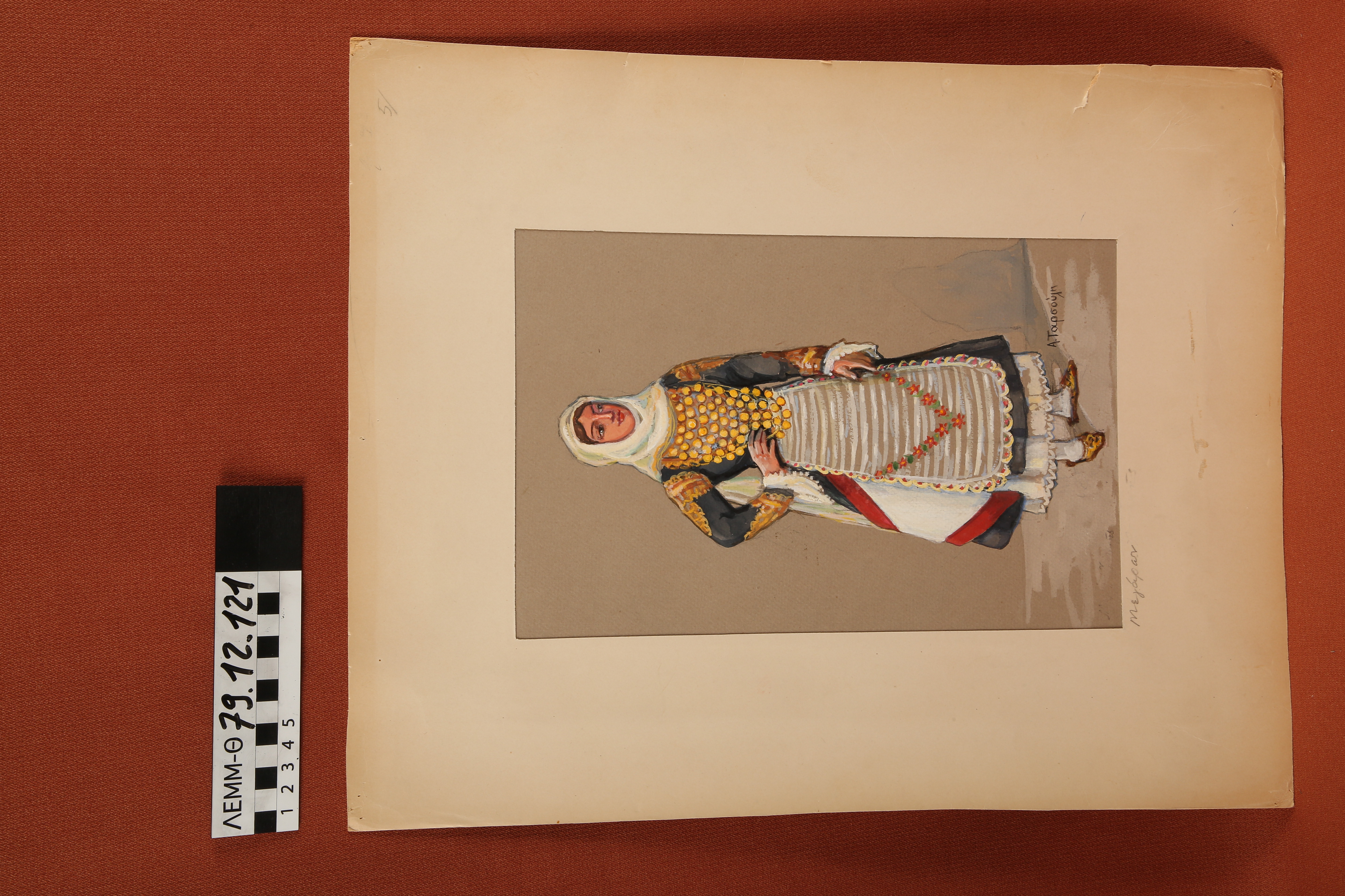 Σχέδιο - σχέδιο χειροποίητο με υδροχρώματα σε χαρτόνι. Απεικονίζει γυναίκα με παραδοσιακή φορεσιά Μεγάρων