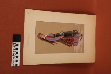 Σχέδιο - σχέδιο χειροποίητο με υδροχρώματα σε χαρτόνι. Απεικονίζει γυναίκα με παραδοσιακή φορεσιά Ζαγορίου Ηπείρου