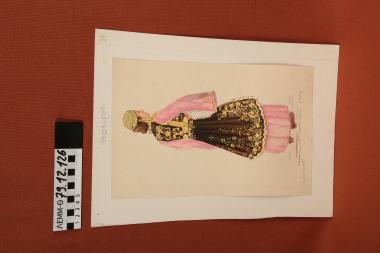 Σχέδιο - σχέδιο χειροποίητο με υδροχρώματα σε χαρτόνι. Απεικονίζει γυναίκα με παραδοσιακή φορεσιά Ιωαννίνων Ηπείρου