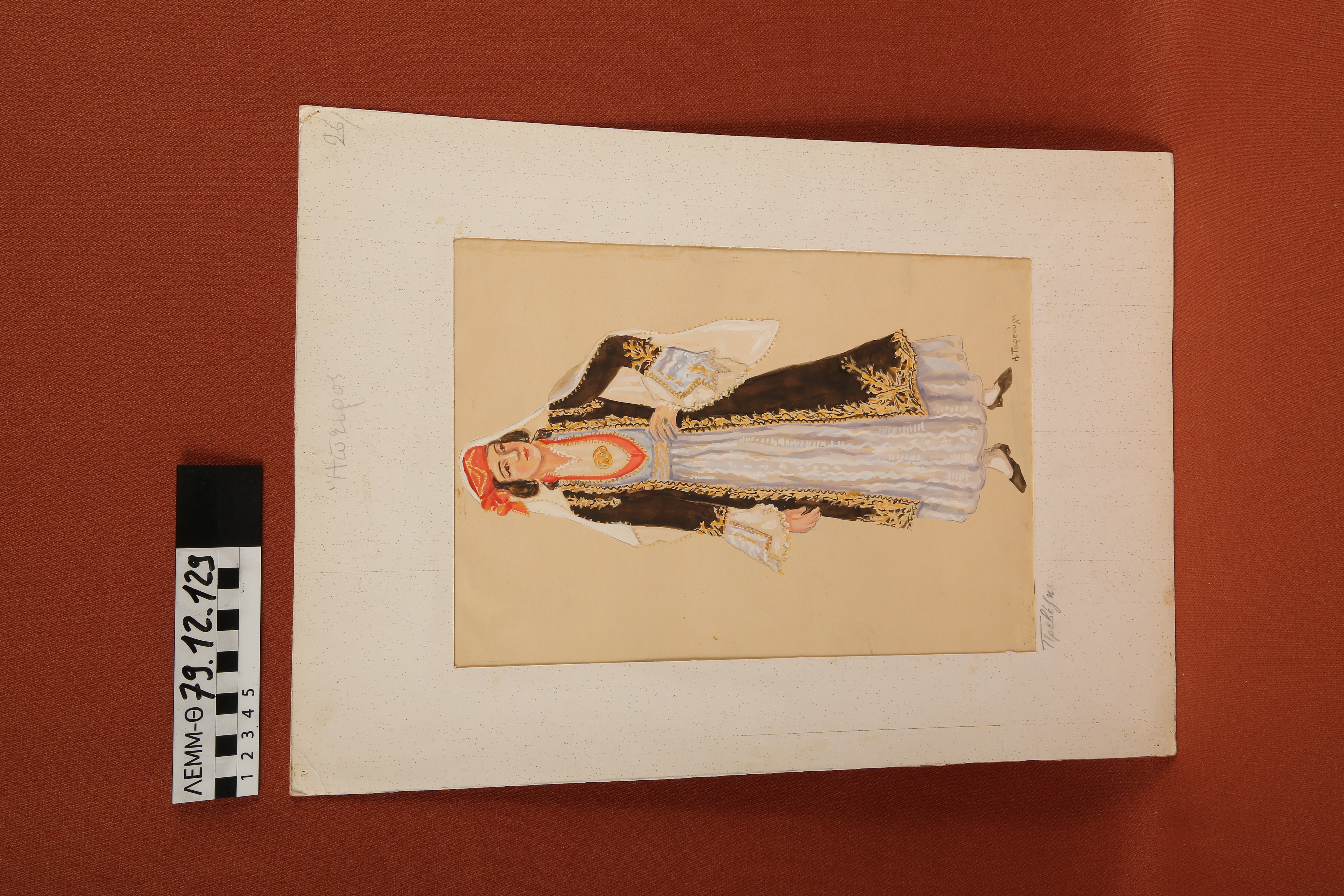Σχέδιο - σχέδιο χειροποίητο με υδροχρώματα σε χαρτόνι. Απεικονίζει γυναίκα με παραδοσιακή φορεσιά Πρέβεζα Ηπείρου