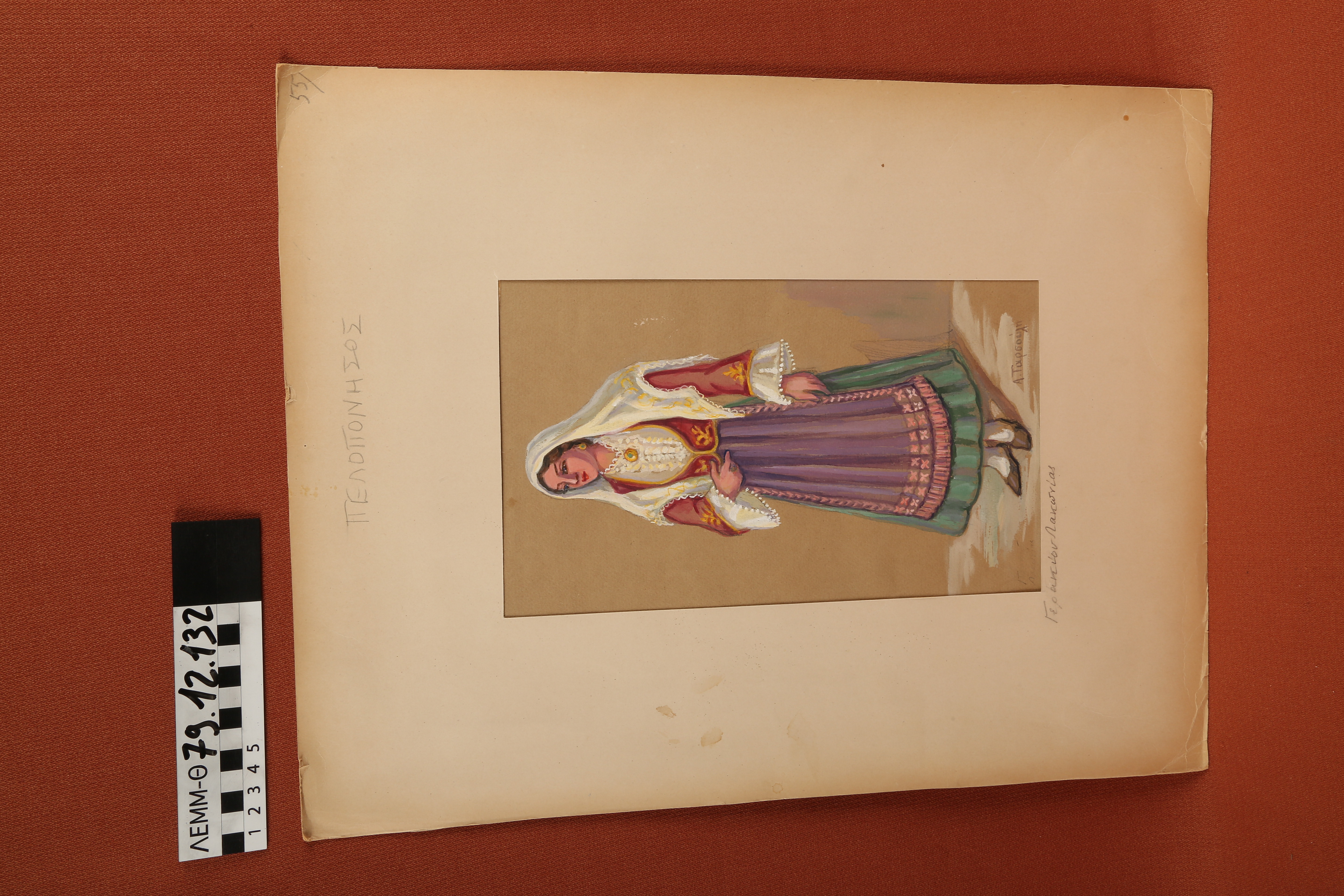 Σχέδιο - σχέδιο χειροποίητο με υδροχρώματα σε χαρτόνι. Απεικονίζει γυναίκα με παραδοσιακή φορεσιά Γερακίου Λακωνίας