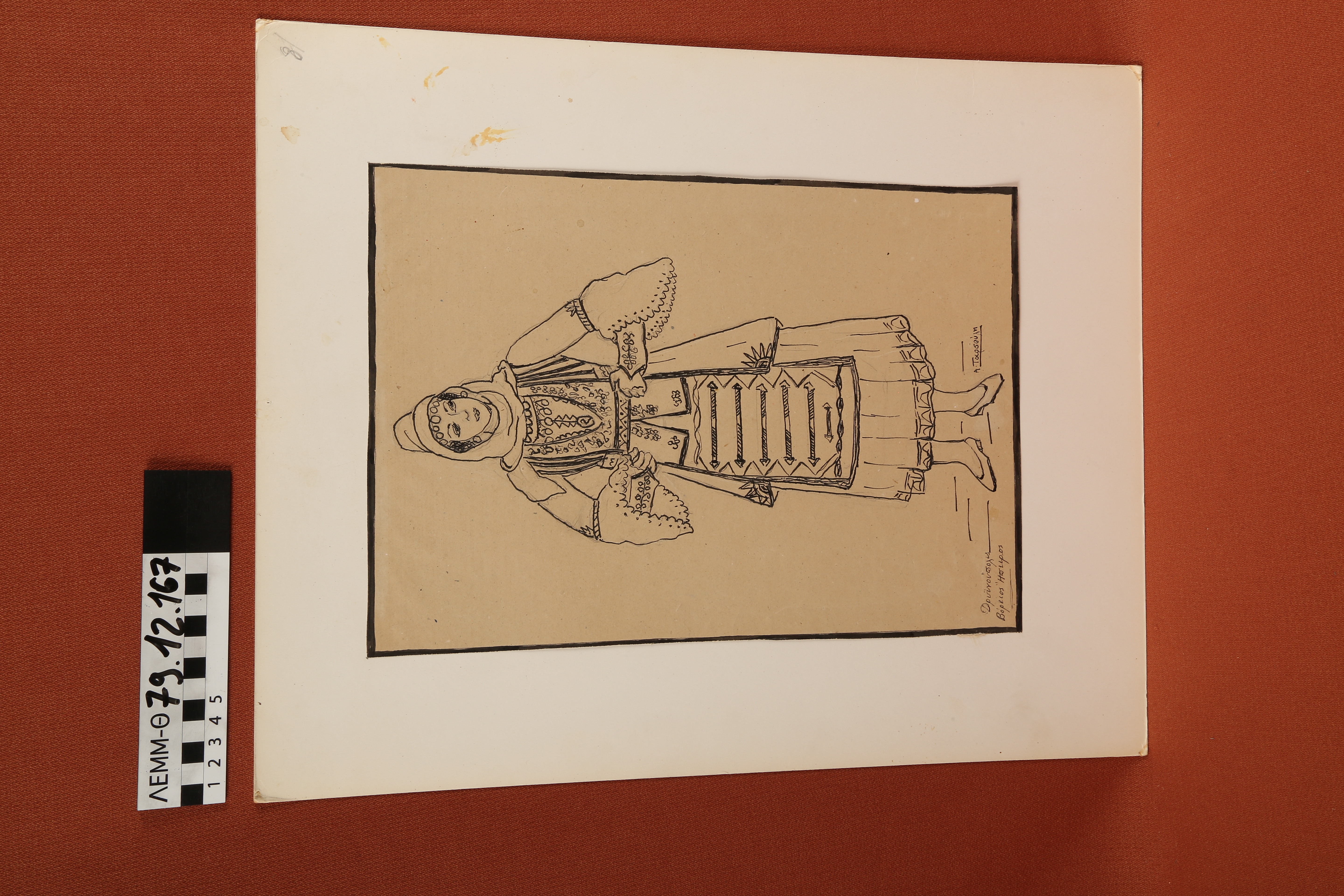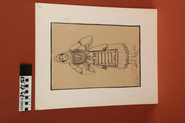 Σχέδιο - σχέδιο χειροποίητο με μελάνι μαύρο σε χαρτόνι. Απεικονίζει γυναίκα με παραδοσιακή φορεσιά Δρυϊνούπολης Βόρειας Ηπείρου