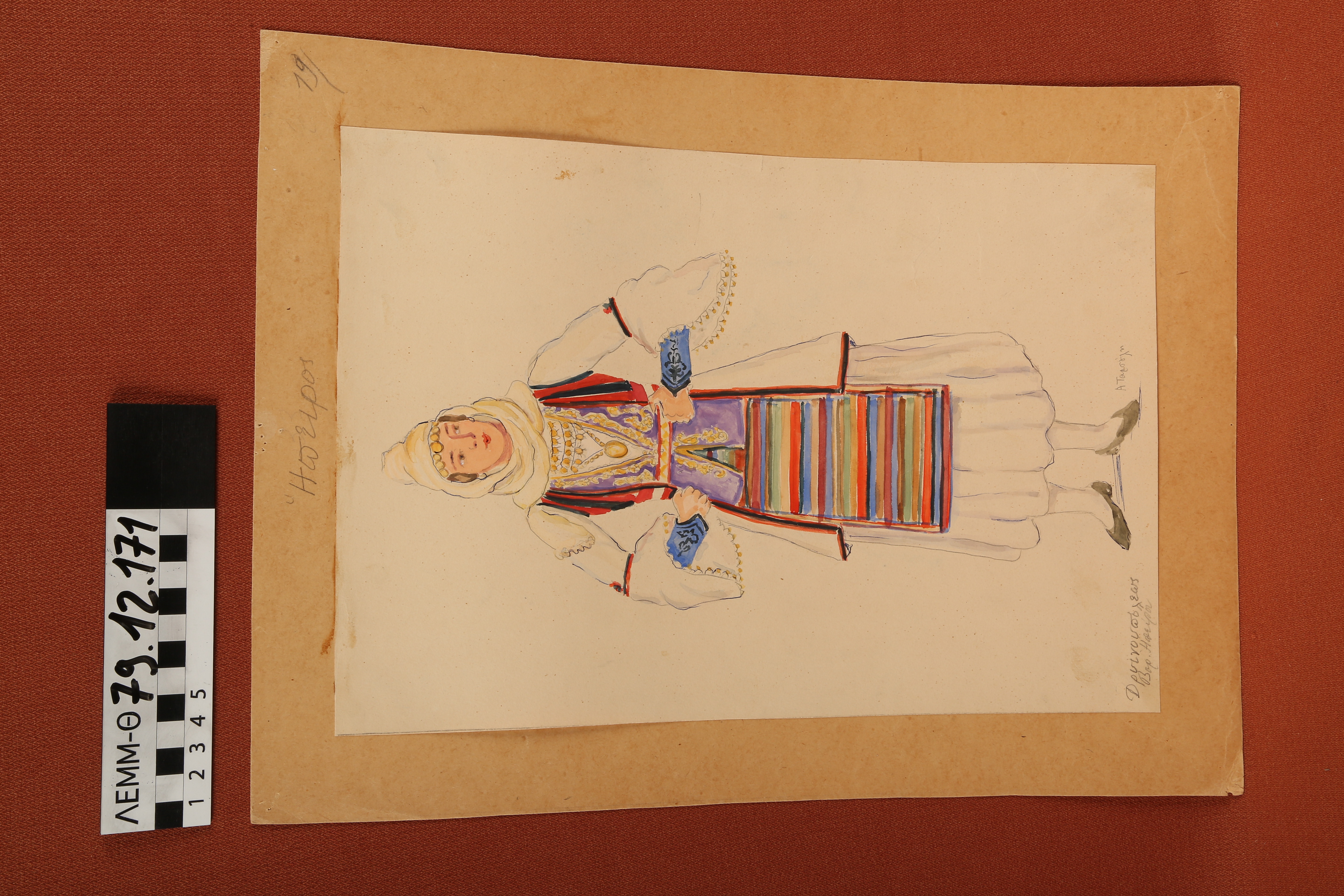 Σχέδιο - σχέδιο χειροποίητο με υδροχρώματα σε χαρτόνι. Απεικονίζει γυναίκα με παραδοσιακή φορεσιά Δρυϊνουπόλεως Βόρειας Ηπείρου