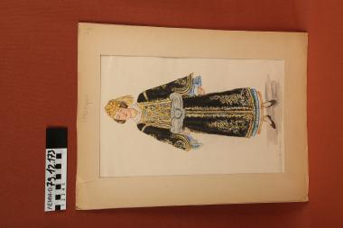 Σχέδιο - σχέδιο χειροποίητο με υδροχρώματα σε χαρτόνι. Απεικονίζει γυναίκα με παραδοσιακή φορεσιά Λιντζουρίας Βόρειας Ηπείρου