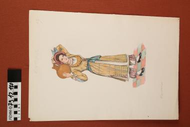 Σχέδιο - σχέδιο χειροποίητο με υδροχρώματα σε χαρτόνι. Απεικονίζει γυναίκα με παραδοσιακή φορεσιά Καρπασίας Κύπρου