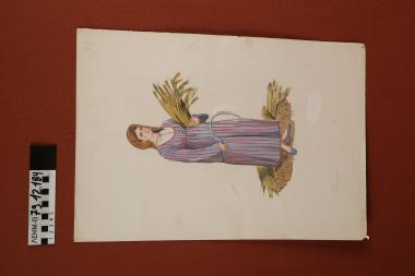 Σχέδιο - σχέδιο χειροποίητο με υδροχρώματα σε χαρτόνι. Απεικονίζει γυναίκα με παραδοσιακή φορεσιά Πάφου Κύπρου