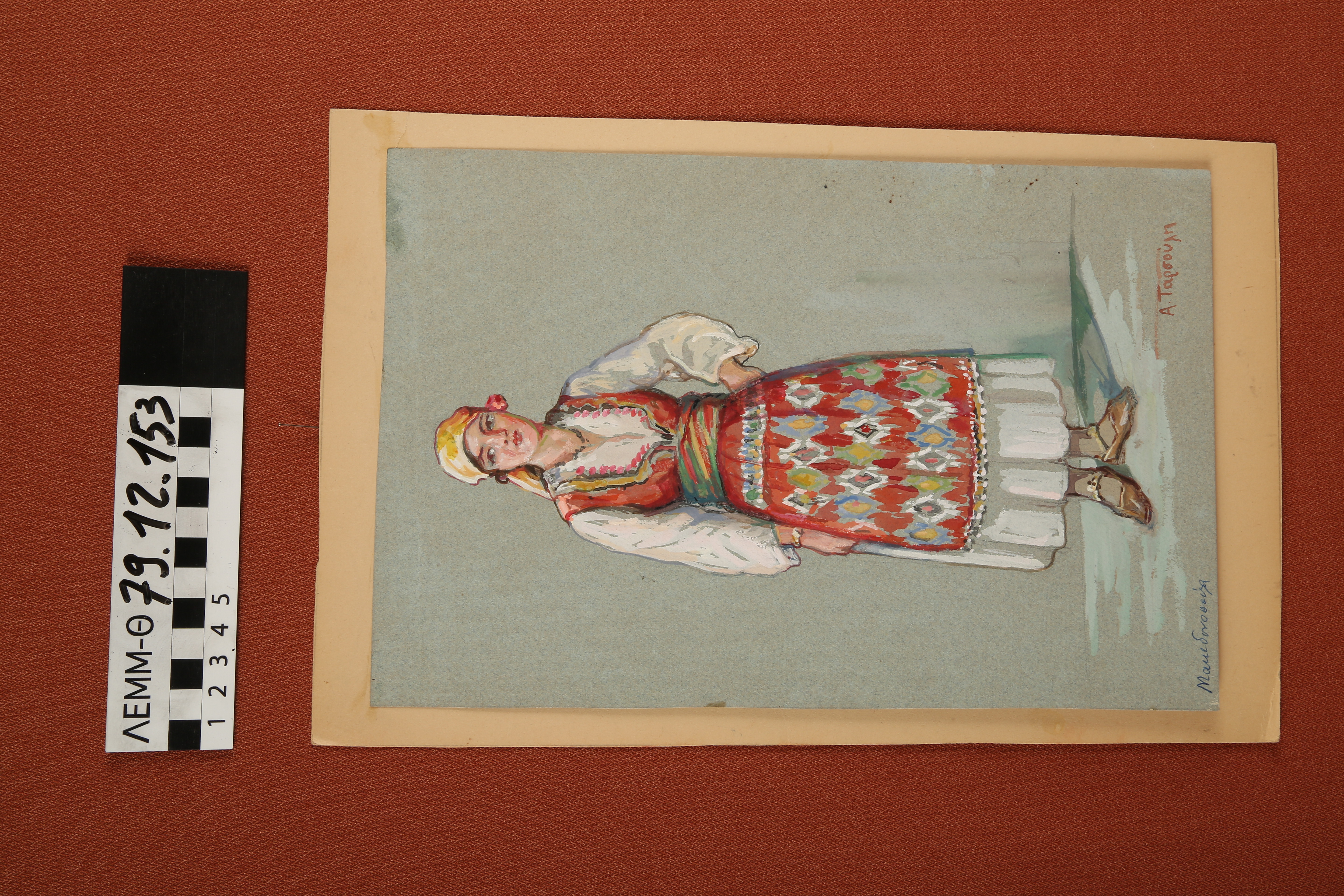 Σχέδιο - σχέδιο χειροποίητο με υδροχρώματα σε χαρτόνι. Απεικονίζει γυναίκα με παραδοσιακή φορεσιά Μακεδονίας