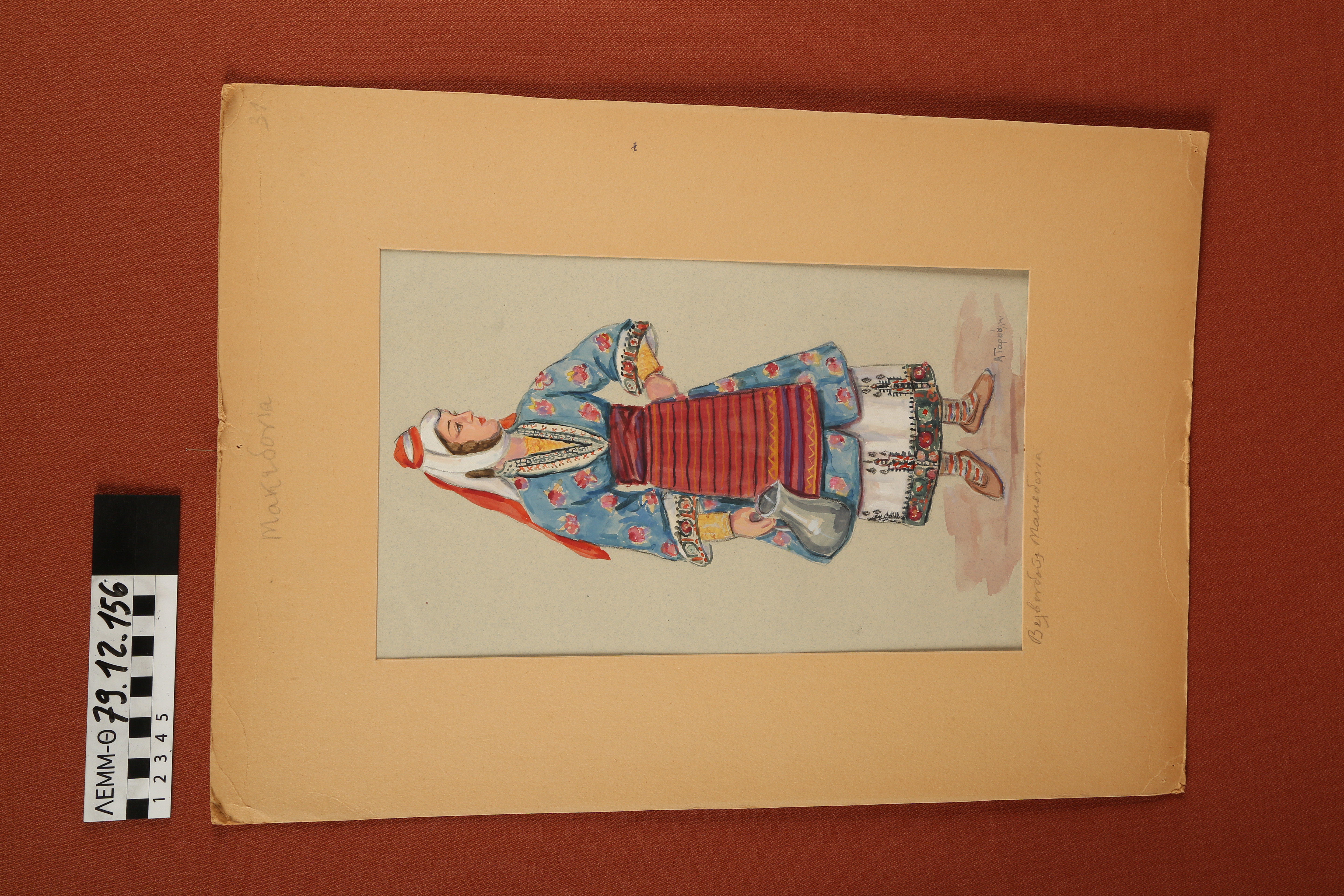Σχέδιο - σχέδιο χειροποίητο με υδροχρώματα σε χαρτόνι. Απεικονίζει γυναίκα με παραδοσιακή φορεσιά από το Βελβενδό Μακεδονίας