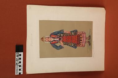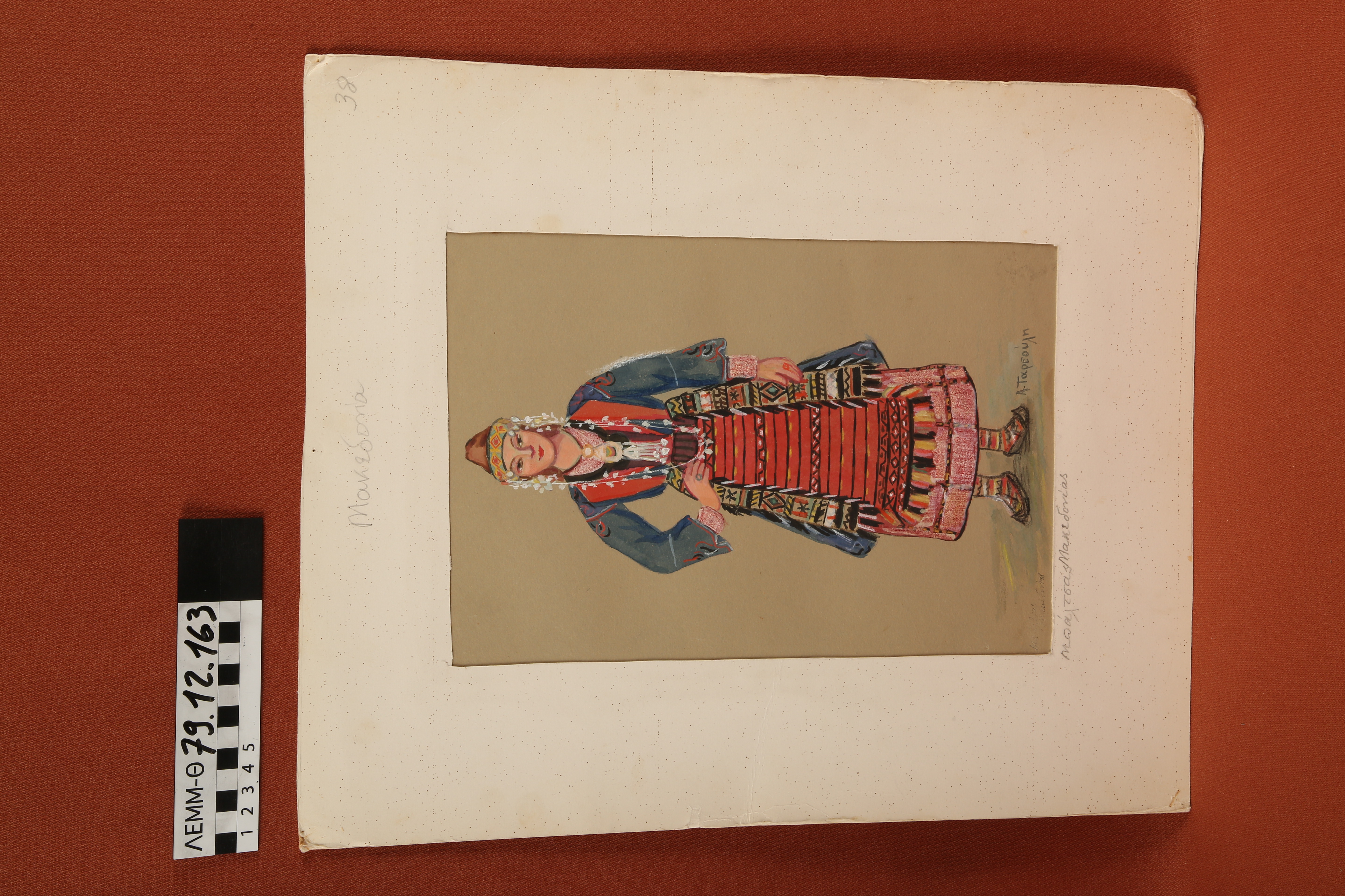 Σχέδιο - σχέδιο χειροποίητο με υδροχρώματα σε χαρτόνι. Απεικονίζει γυναίκα με παραδοσιακή φορεσιά Μπάλτσας (Μελισσοχωρίου) Μακεδονίας