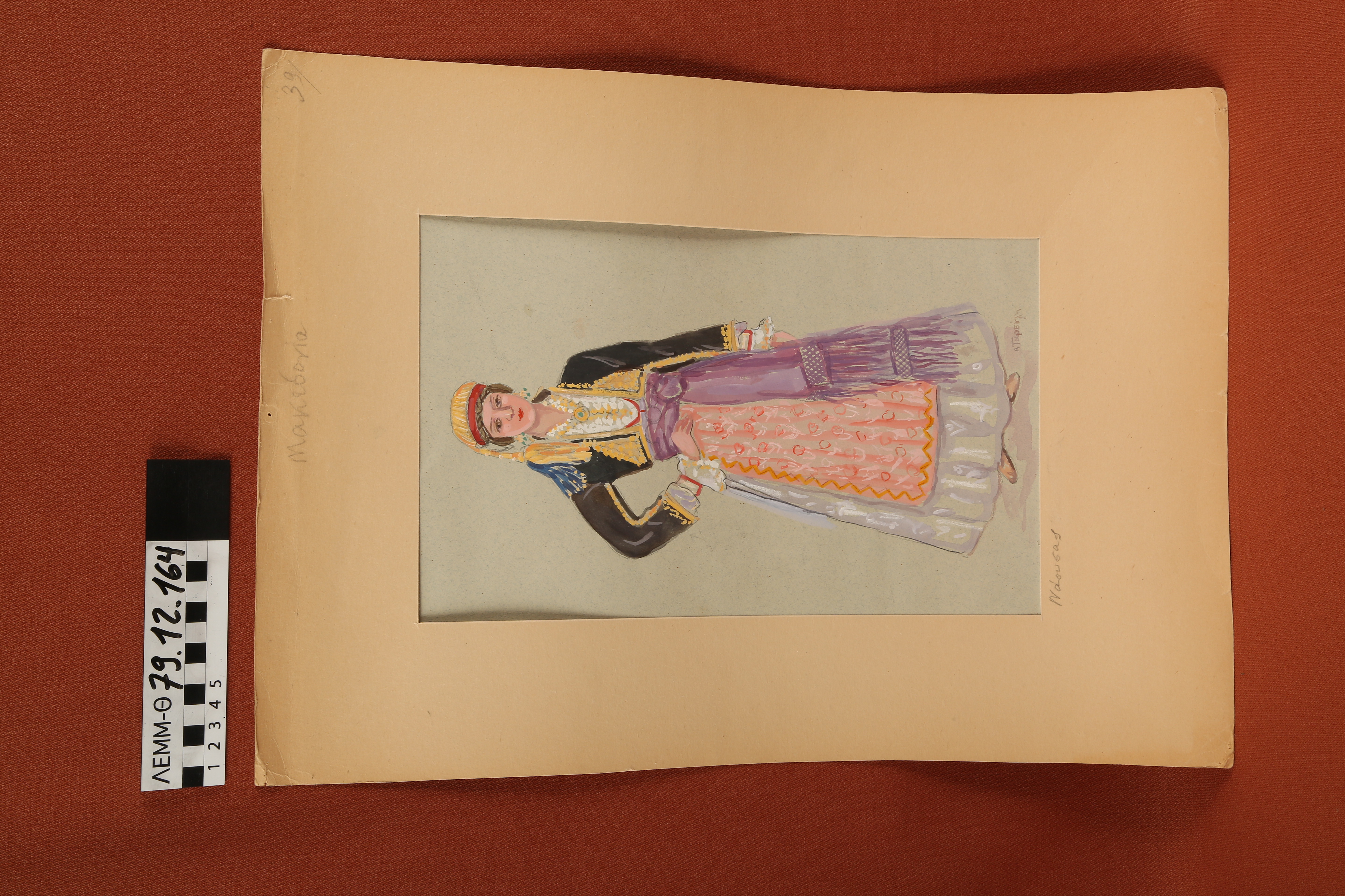 Σχέδιο - σχέδιο χειροποίητο με υδροχρώματα σε χαρτόνι. Απεικονίζει γυναίκα με παραδοσιακή φορεσιά Νάουσας Μακεδονίας