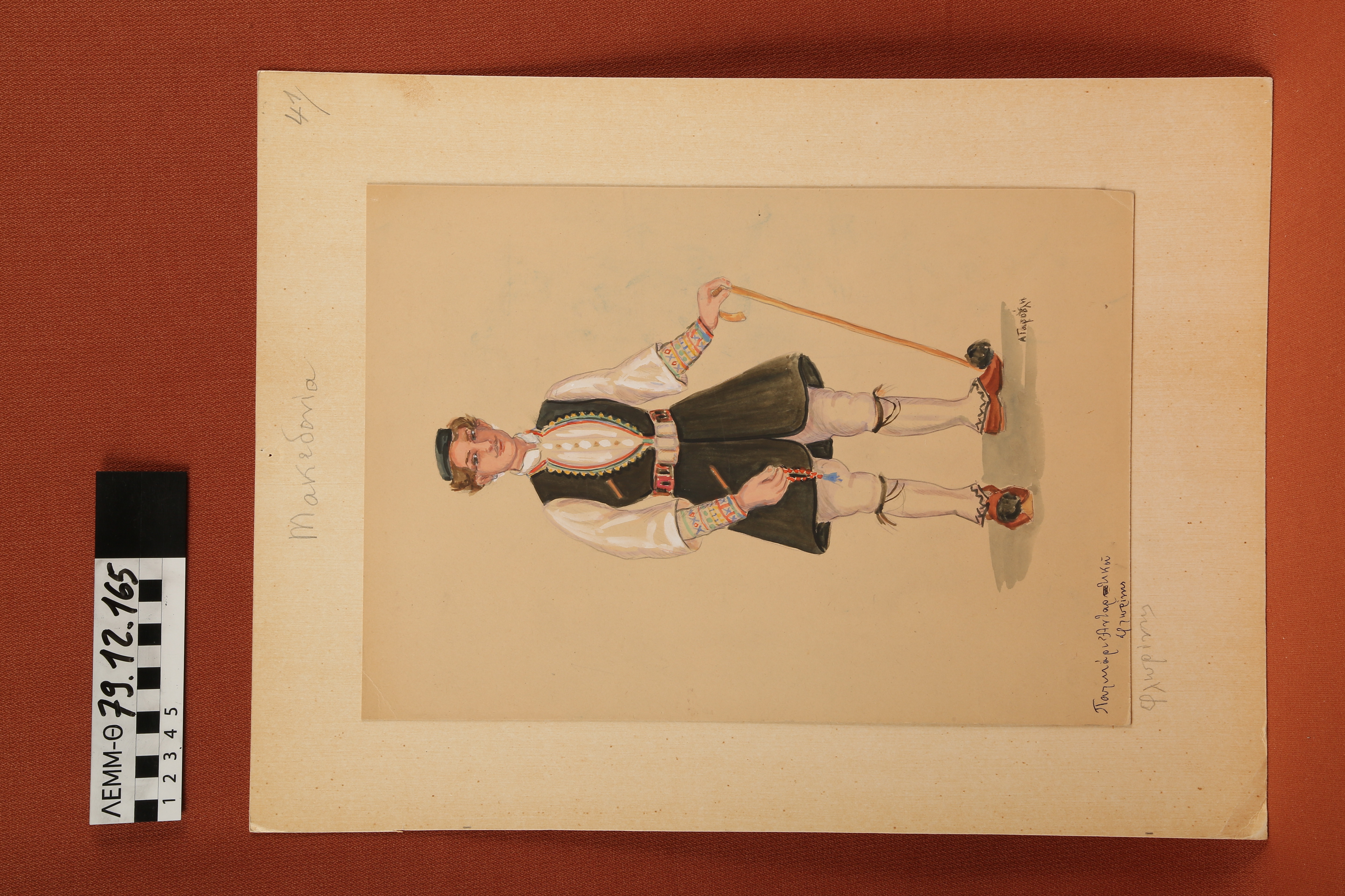 Σχέδιο - σχέδιο χειροποίητο με υδροχρώματα σε χαρτόνι. Απεικονίζει άνδρα με παραδοσιακή φορεσιά Ανταρτικού Φλώρινας Μακεδονίας