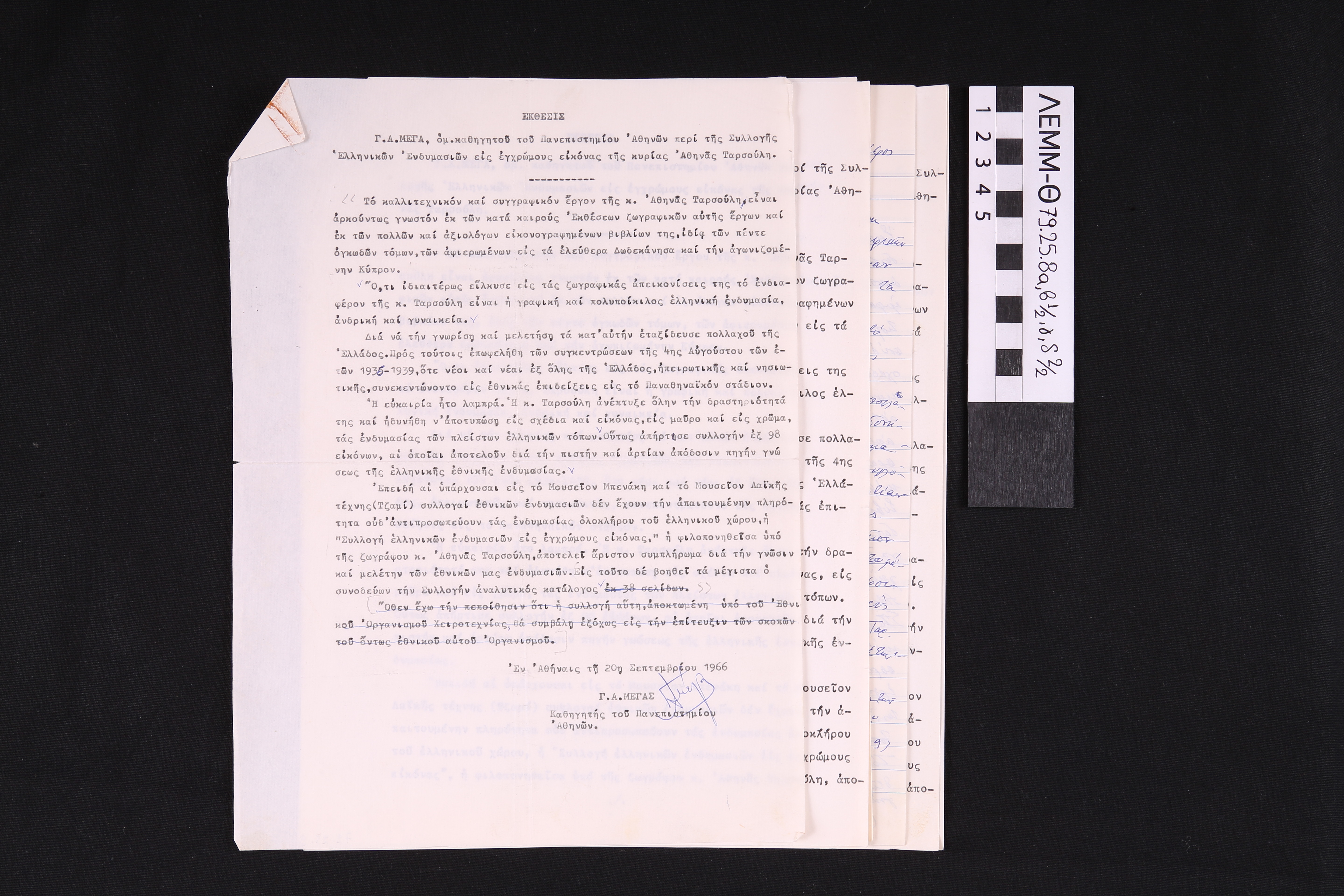 Έκθεση Γ. Α. Μέγα - έκθεση του Γ. Α. Μέγα, δακτυλογραφημένη και υπογεγραμμένη, για τη συλλογή έγχρωμων σχεδίων ελληνικών ενδυμασιών της Αθηνάς Ταρσούλη