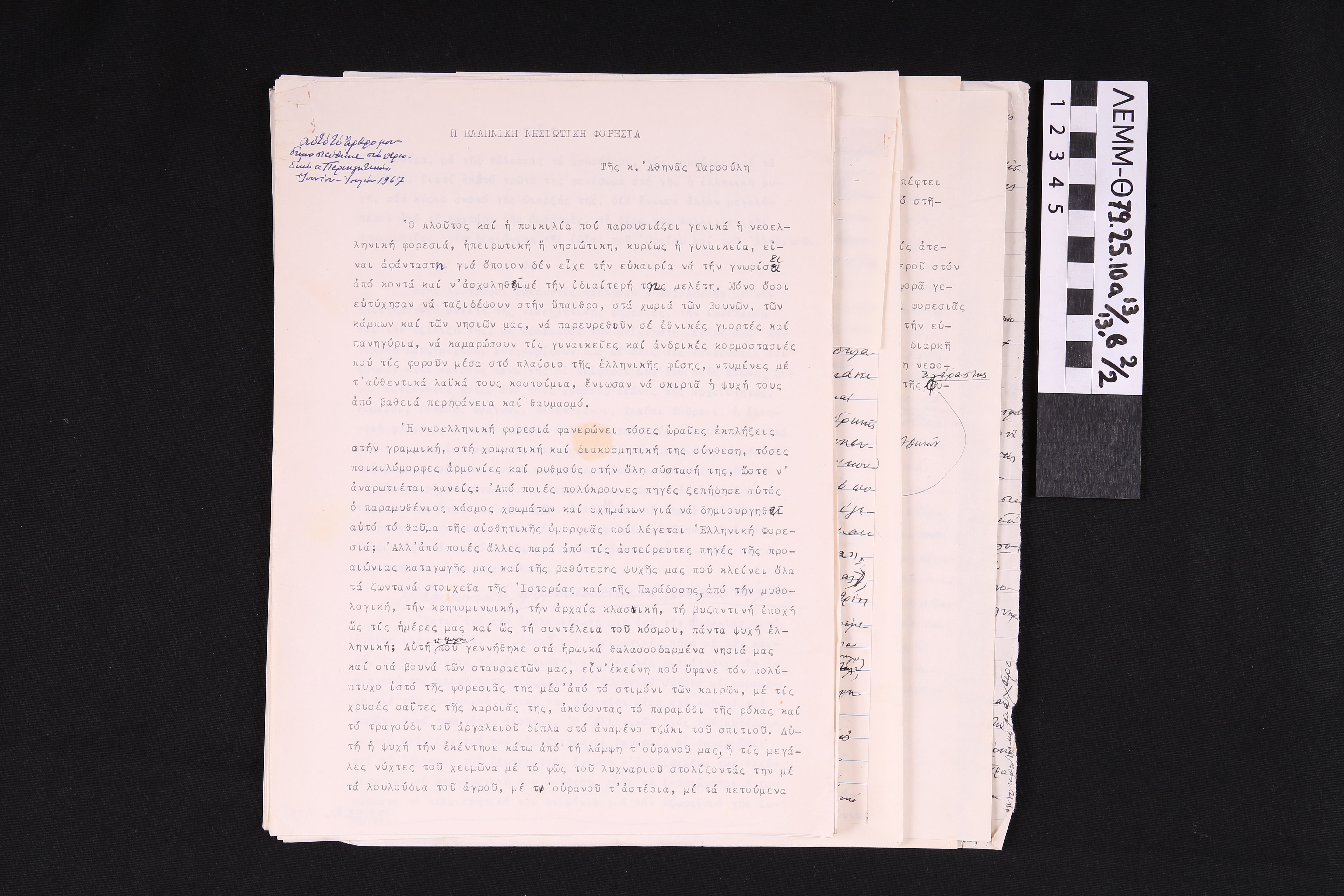 Άρθρο Ταρσούλη - κείμενο δακτυλογραφημένο και χειρόγραφο της Αθηνάς Ταρσούλη με τίτλο "Η ελληνική νησιωτική φορεσιά"