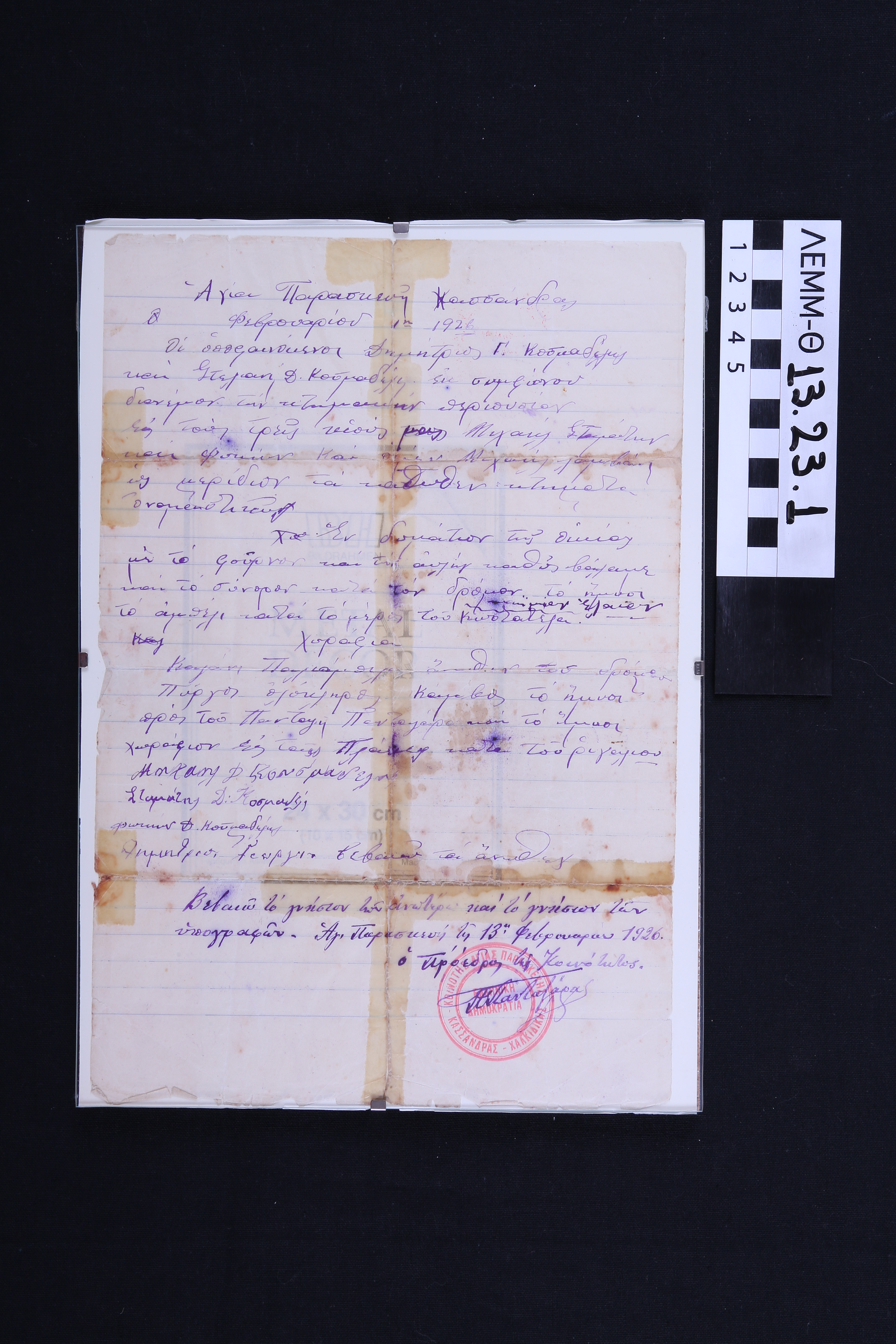 Διαθήκη - διαθήκη χειρόγραφη του Δημήτριου Γ. Κοσμαδέλη και Στελιανής Δ. Κοσμαδέλη, επικυρωμένη από τον πρόεδρο της κοινότητας Αγίας Παρασκευής Κασσάνδρας Χαλκιδικής, 1926