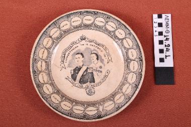 πιάτο πορσελάνινο εφυαλωμένο με μαύρο γραπτό διάκοσμο. Στο κέντρο απεικονίζεται το βασιλικό ζεύγος Γεώργιος Α' και Όλγα. Επάνω από το ζεύγος υπάρχει απεικόνιση κορώνας και επιγραφή "ΕΝΟΤΗΣ ΕΛΛΗΝΙΚΗΣ ΦΥΛΗΣ/ΙΣΧΥΣ ΜΟΥ ΑΓΑΠΗ ΤΟΥ ΛΑΟΥ/ΕΝΥΜΦΕΥΘΗΣΑΝ ΤΗ 15 ΟΚΤΩΒΡΙΟΥ 1867". Κάτω από την απεικόνιση του ζεύγους υπάρχει εθνόσημο και επιγραφή "Ο ΘΕΟΣ ΣΩΖΟΙ ΤΟ ΒΑΣΙΛΙΚΟΝ ΖΕΥΓΟΣ". Στο περιθώριο του πιάτου περιμετρικά αναπτύσσεται επιγραφή "ΘΡΑΚΗ, ΡΟΔΟΣ, ΚΥΠΡΟΣ, ΠΑΤΜΟΣ, ΚΩΣ, ΜΙΤΥΛΗΝΗ, ΧΙΟΣ, ΣΑΜΟΣ, ΚΡΗΤΗ, ΜΑΚΕΔΟΝΙΑ, ΘΕΣΣΑΛΙΑ