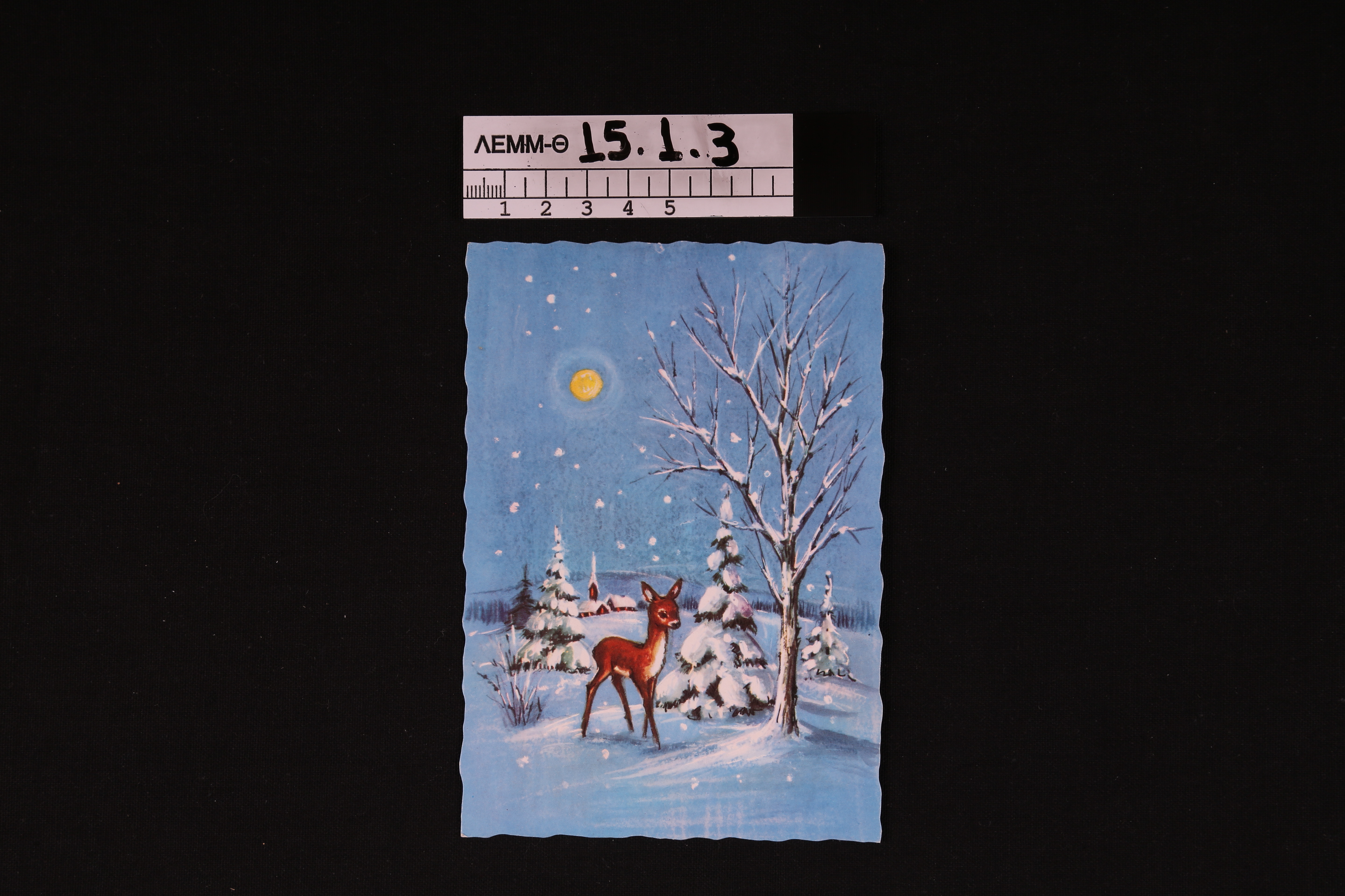 Κάρτα - καρτ ποστάλ χριστουγεννιάτικη με εκτύπωση χιονισμένου τοπίο με ελαφάκι