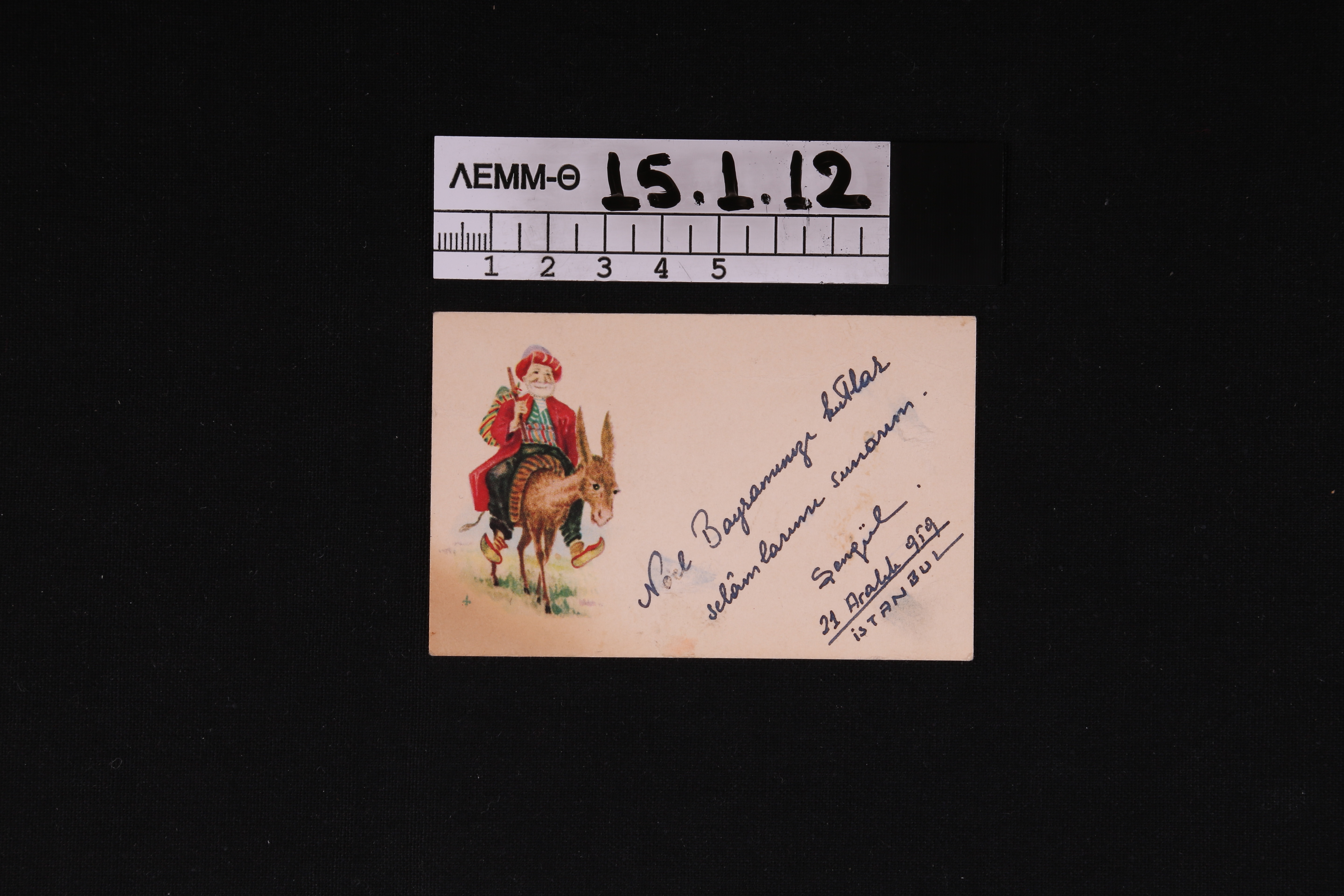 Κάρτα - καρτ ποστάλ με εκτύπωση παράστασης ηλικιωμένου άνδρα με παραδοσιακή ενδυμασία επάνω σε γαϊδουράκι. Τούρκικη
