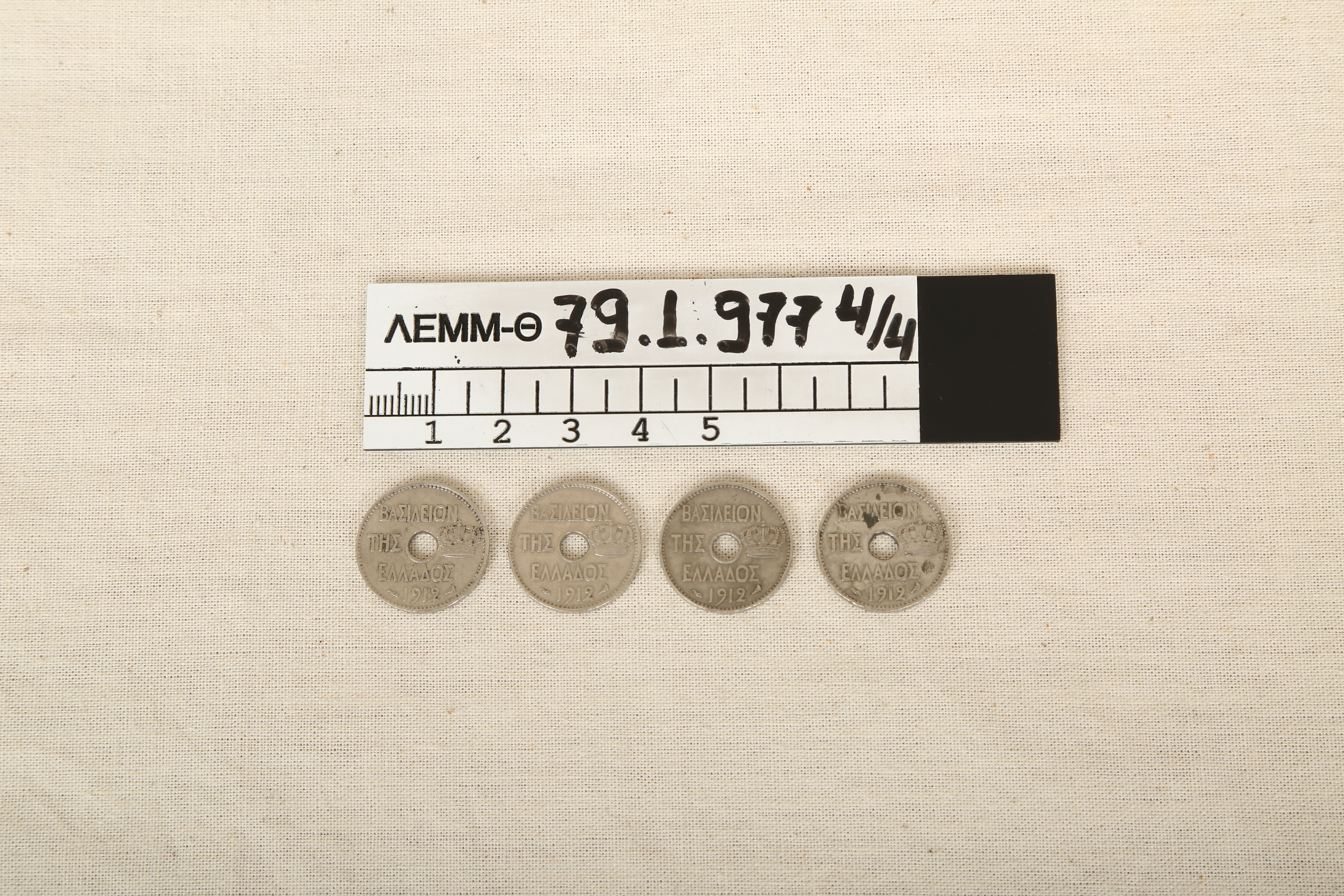 Νομίσματα - νομίσματα μεταλλικά (τέσσερα) με οπή, πέντε λεπτών της δραχμής, Βασιλείου της Ελλάδος, κοπής 1912