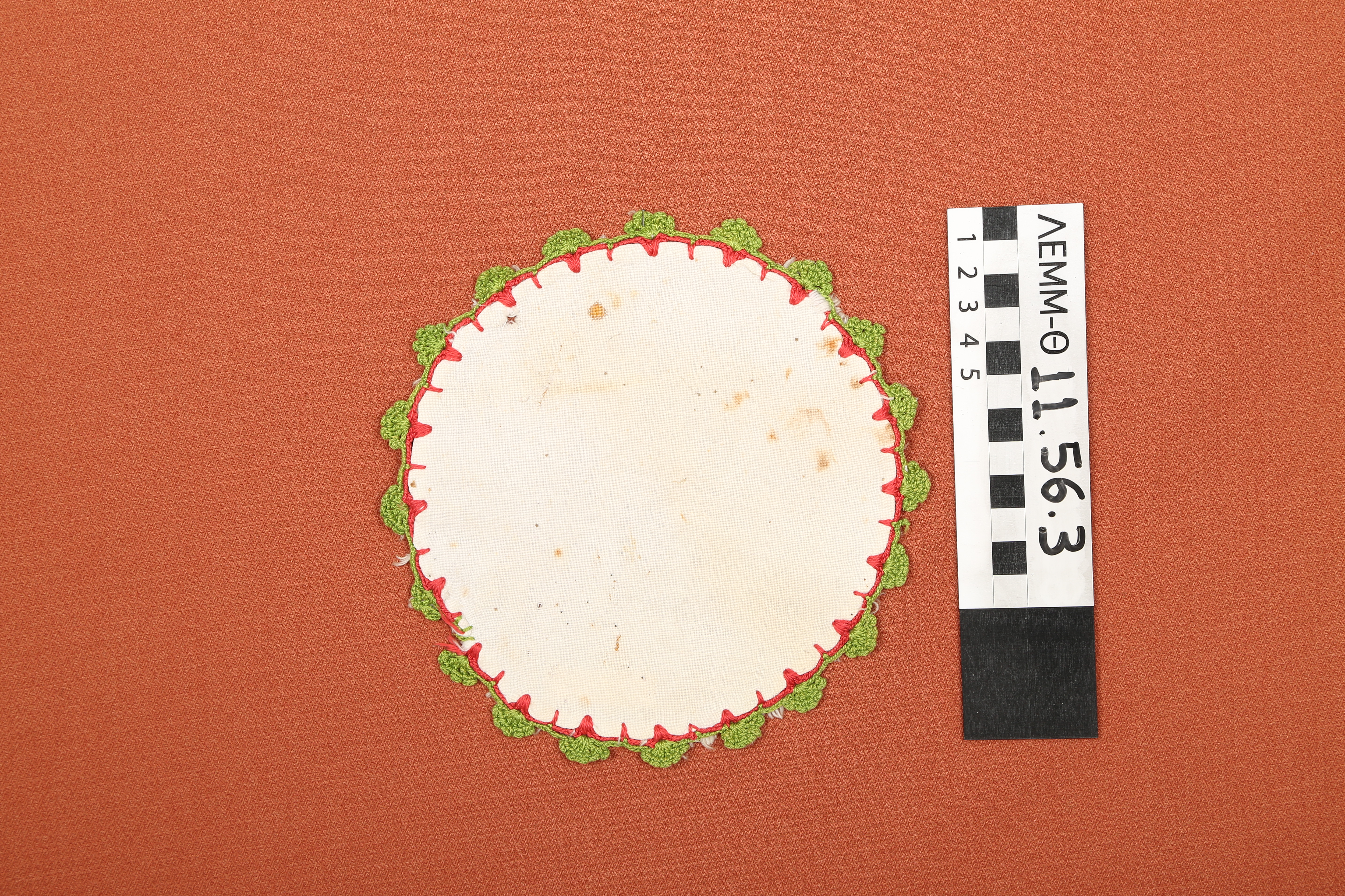 Πετσετάκι κανάτας - πετσετάκι βαμβακερό υπόλευκο κυκλικό, με φεστόνι κόκκινο και μπιμπίλα πλεκτή πράσινη