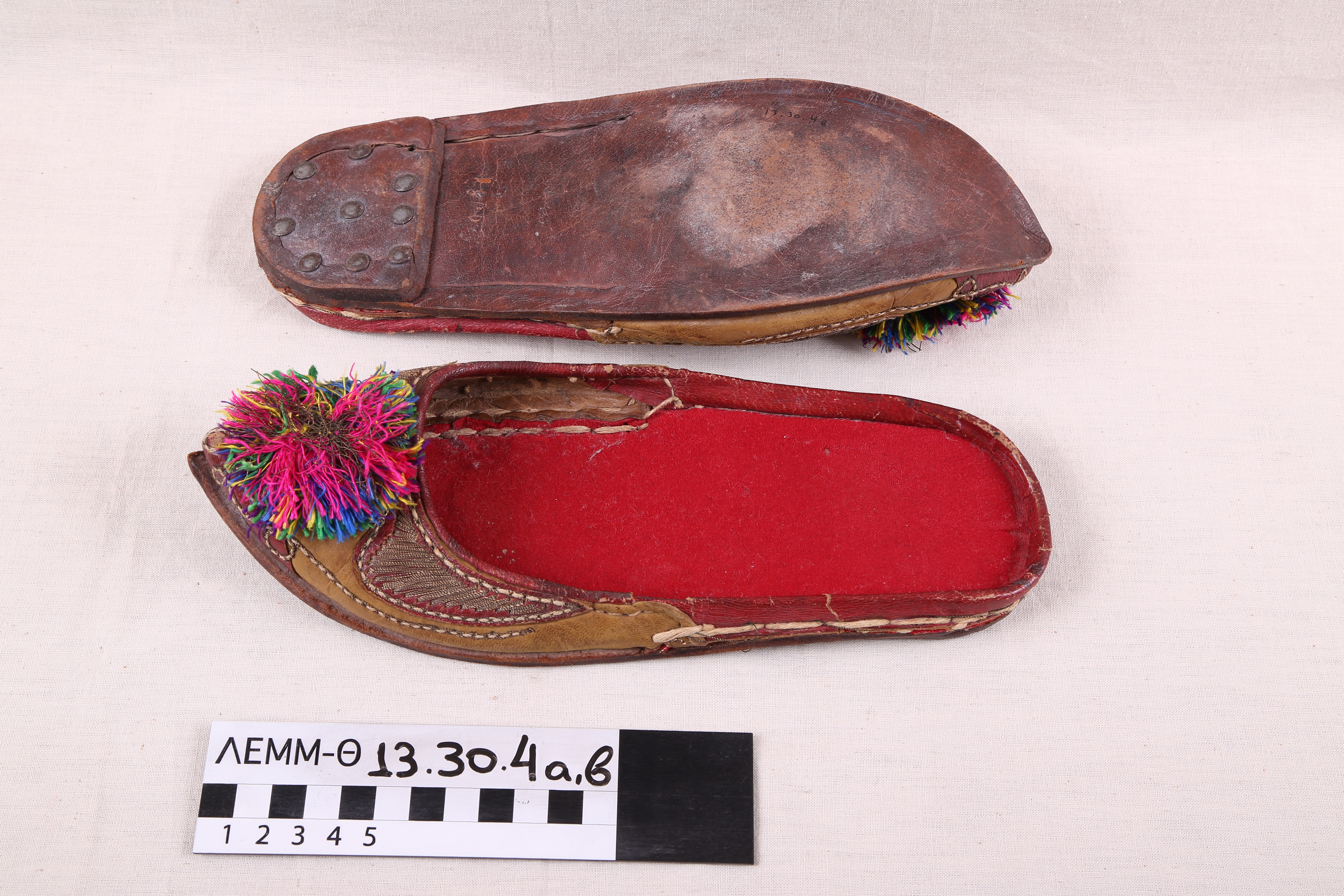 Υποδήματα - ζεύγος υποδήματα δερμάτινα σε μπεζ και μπορντώ χρώμα, ανοιχτά στη φτέρνα, με ανασηκωμένη μύτη με πολύχρωμη φούντα και κέντημα με χρυσοκλωστές
