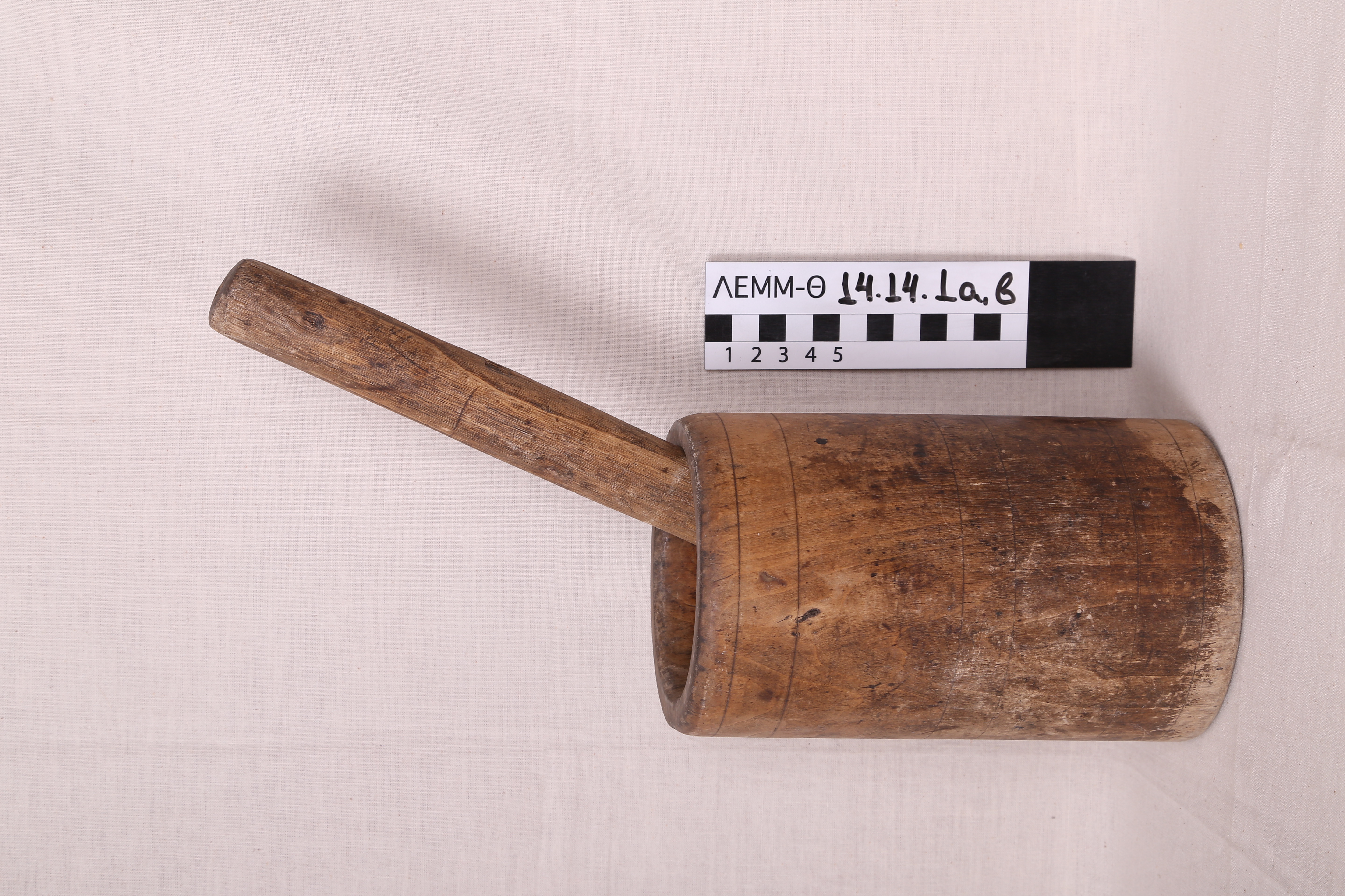 Γουδί με γουδοχέρι - γουδί με γουδοχέρι ξύλινο, με διακόσμηση τριών παράλληλων περιμετρικών ζωνών με εγχάρακτα όρια