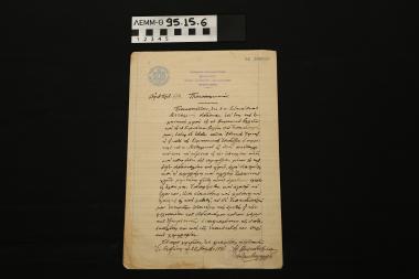 Πιστοποιητικό - χειρόγραφο κείμενο σε κόλλα αναφοράς με το οποίο η Σταμ. Πατρικίου-Βαλαγιάννη, διευθύντρια των Ελληνικών Εκπαιδευτηρίων Θηλέων πιστοποιεί την προϋπηρεσία του Ευστάθιου Μεταλλινού ως διδασκάλου ελληνικών παραδοσιακών χορών και διοργανωτή εκ