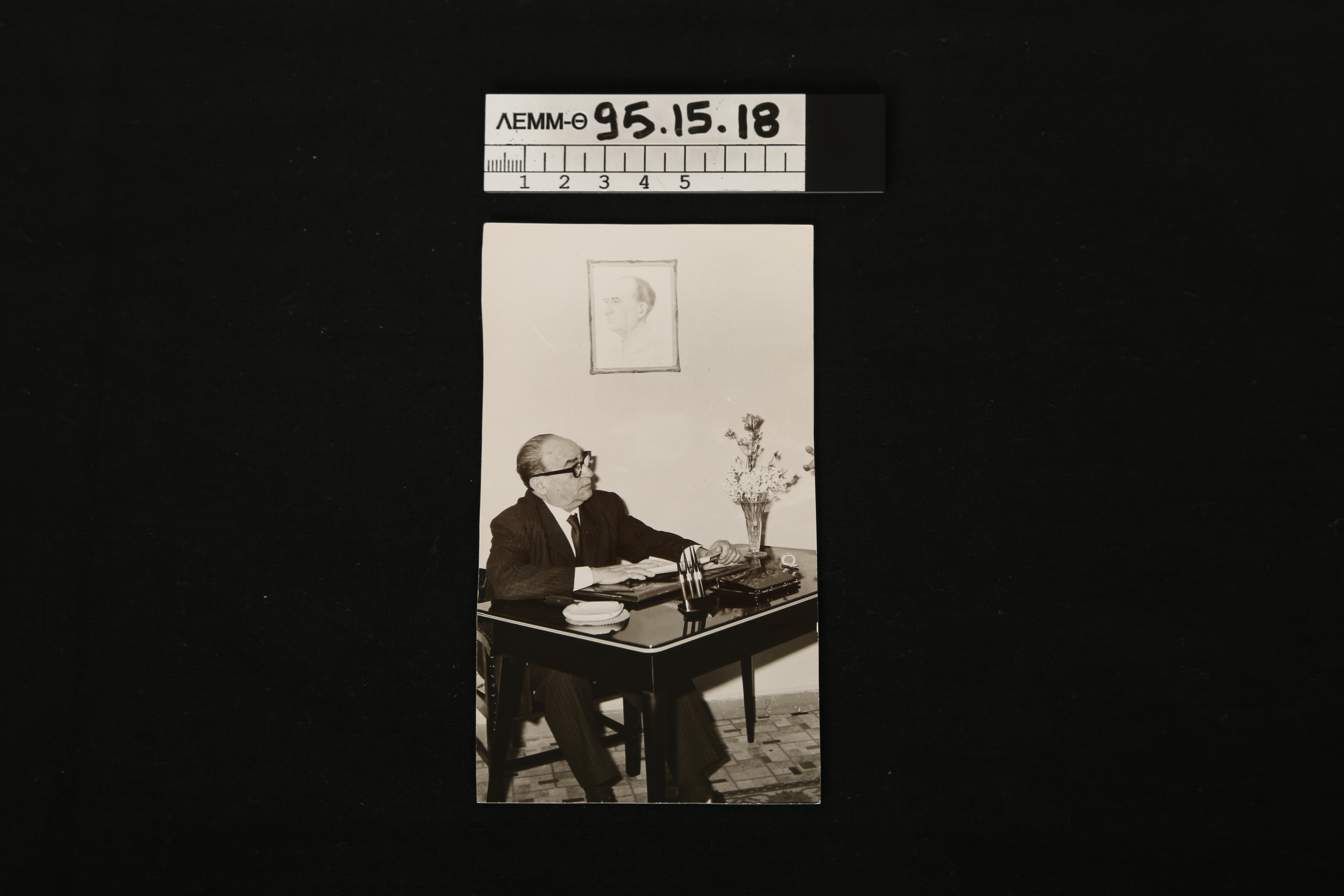 Φωτογραφία - φωτογραφία ασπρόμαυρη που απεικονίζει ηλικιωμένο άνδρα που κάθεται σε γραφείο