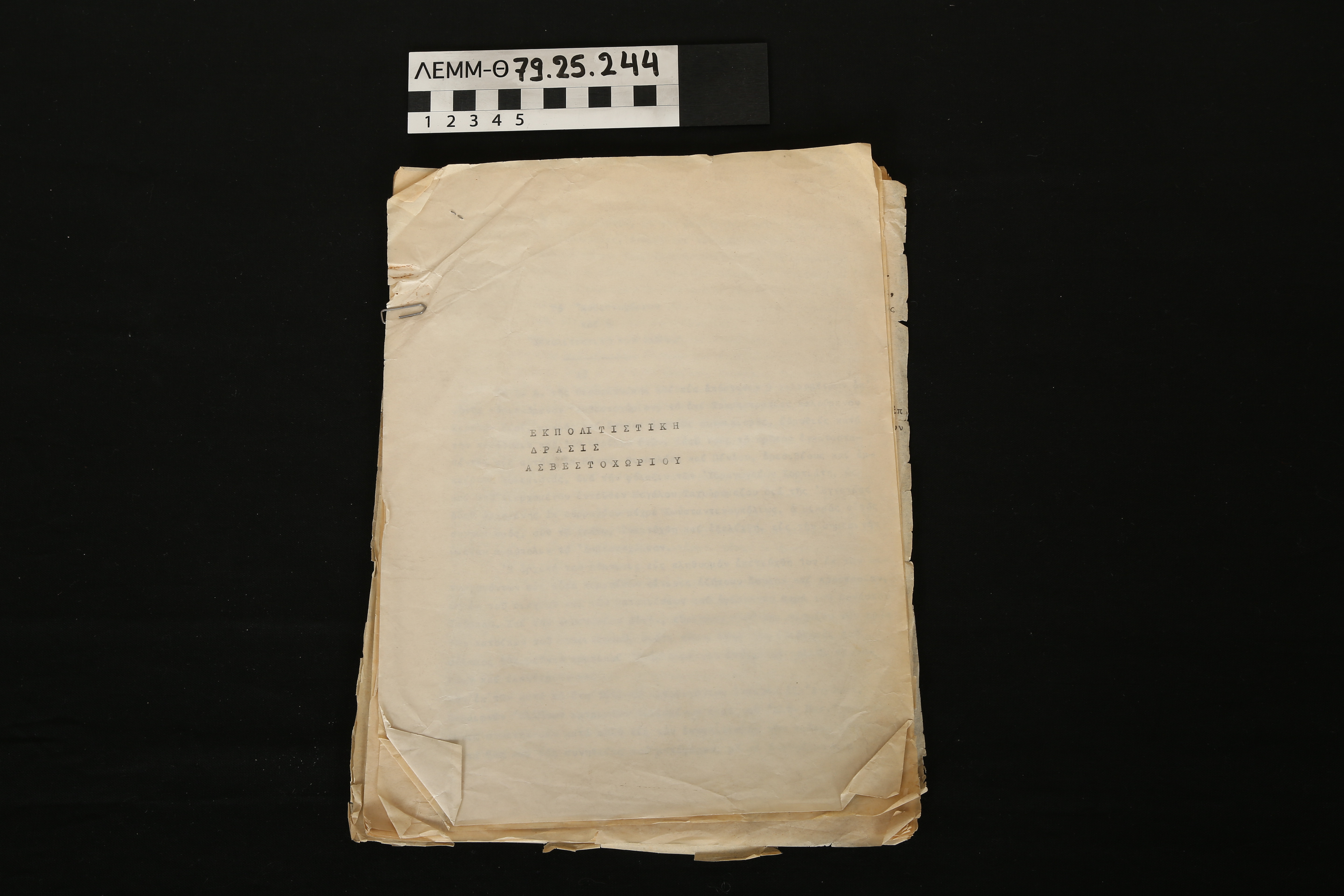 Έκθεση δακτυλογραφημένη - κείμενο δακτυλογραφημένο σε 21 φύλλα, του ιατρού Χαρίλαου Γ. Τσέκου, με τρία κεφάλαια ("Εκπολιτιστική δράσις Ασβεστοχωρίου", "Αγώνες Ασβεστοχωρίου", "Μία σελίς περί των σχολείων της Κοινότητος Ασβεστοχωρίου"), 1964-1966