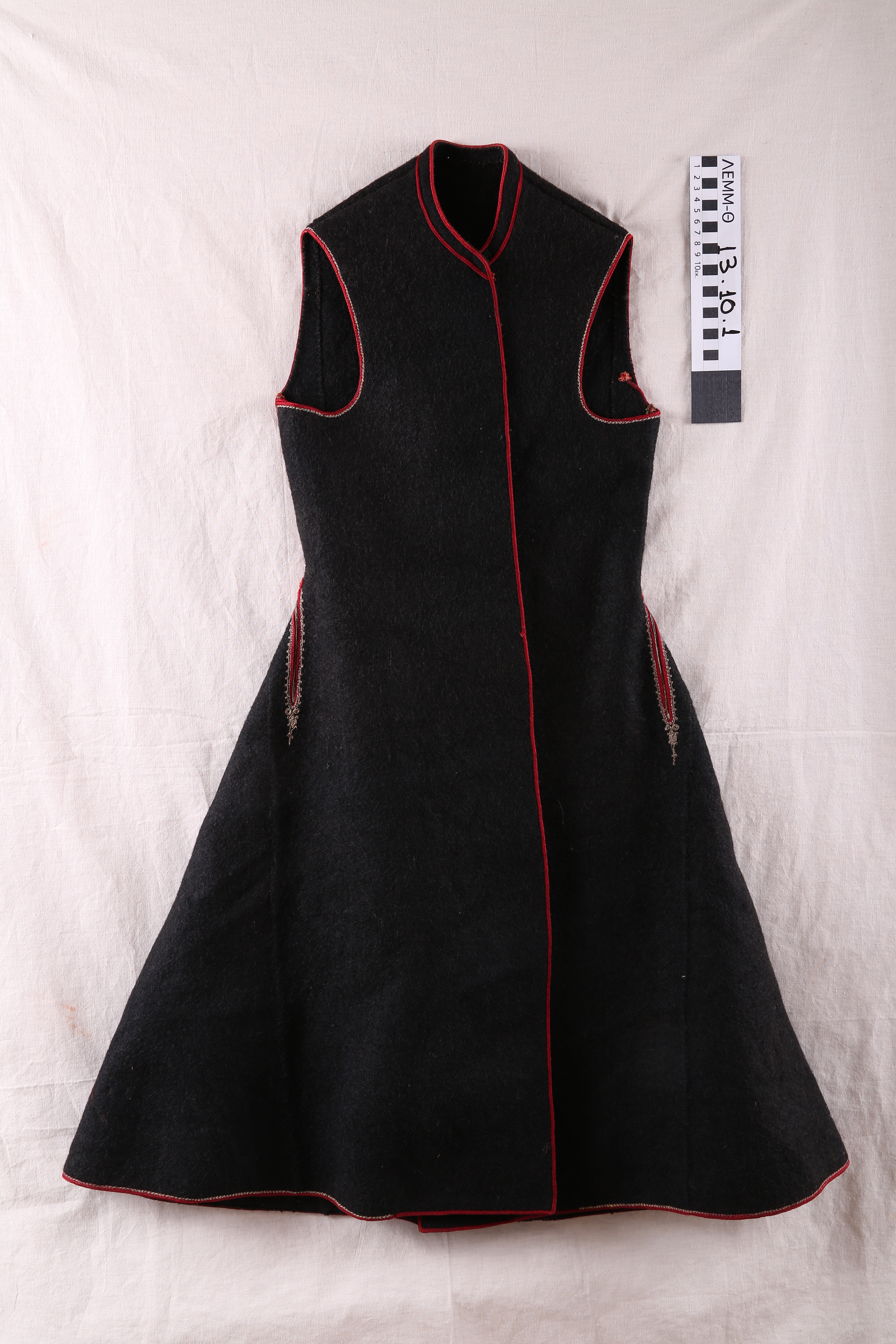 Επενδύτης - επενδύτης μάλλινος της νεροτριβής, μαύρος, αμάνικος, με κατακόρυφο άνοιγμα μπροστά έως κάτω και στρογγυλή λαιμόκοψη. Διακοσμείται περιμετρικά σε όλα τα ανοίγματα από κόκκινο γαϊτάνι, στον ποδόγυρο, στις καβαδούρες και στις ενώσεις του κορμού α