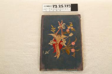 τετράδιο με εξώφυλλο επενδεδυμένο με ύφασμα από βαμβάκι (στημόνι) και μετάξι (υφάδι) μπλε με κεντητή διακόσμηση με βελονιά ανεβατή, κομποβελονιά, βυζαντινή, ριζοβελονιά. Το κέντημα απεικονίζει τον Έρωτα, σε εκρού χρώμα, να καρφώνει το βέλος του σε μία καρδιά κόκκινη, η οποία φέρει κεντημένο με κόκκινη κλωστή το όνομα "Αικατερίνη". Το κεντρικό θέμα πλαισιώνεται από φυτικό διάκοσμο με ρόζ άνθη και πράσινα φύλλα. Στο εσώφυλλο φέρει επικολλημένο απόκομμα χαρακτικού έργου που απεικονίζει νέο άνδρα ανεβασμένο στ