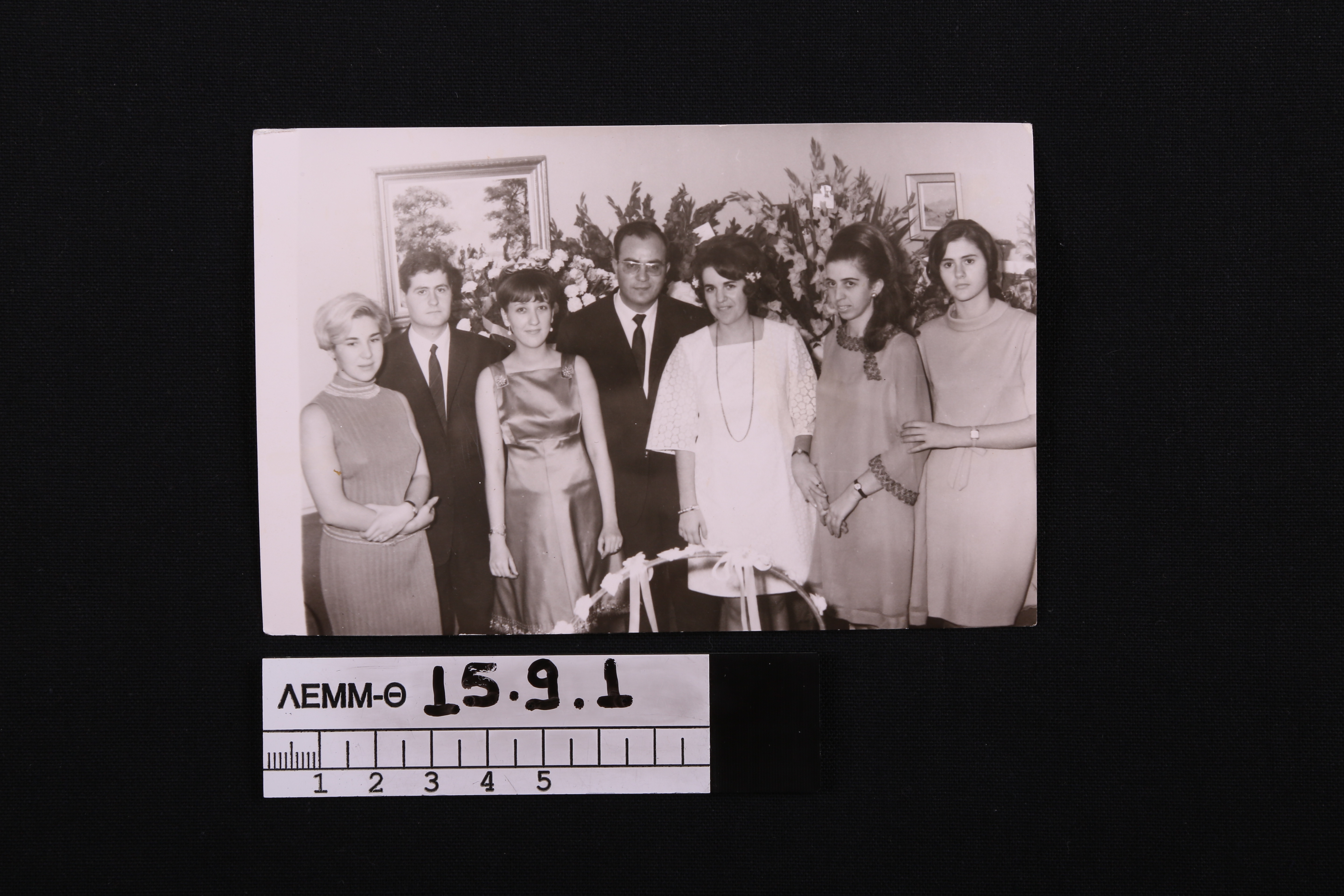 Φωτογραφία - φωτογραφία ασπρόμαυρη που απεικονίζει δύο άνδρες και πέντε γυναίκες (η μία είναι η δωρήτρια Χαρίκλεια Σάκκη) ντυμένες με φορέματα της δεκαετίας του 1960, που ποζάρουν με φόντο ανθοδέσμες και δύο κάδρα