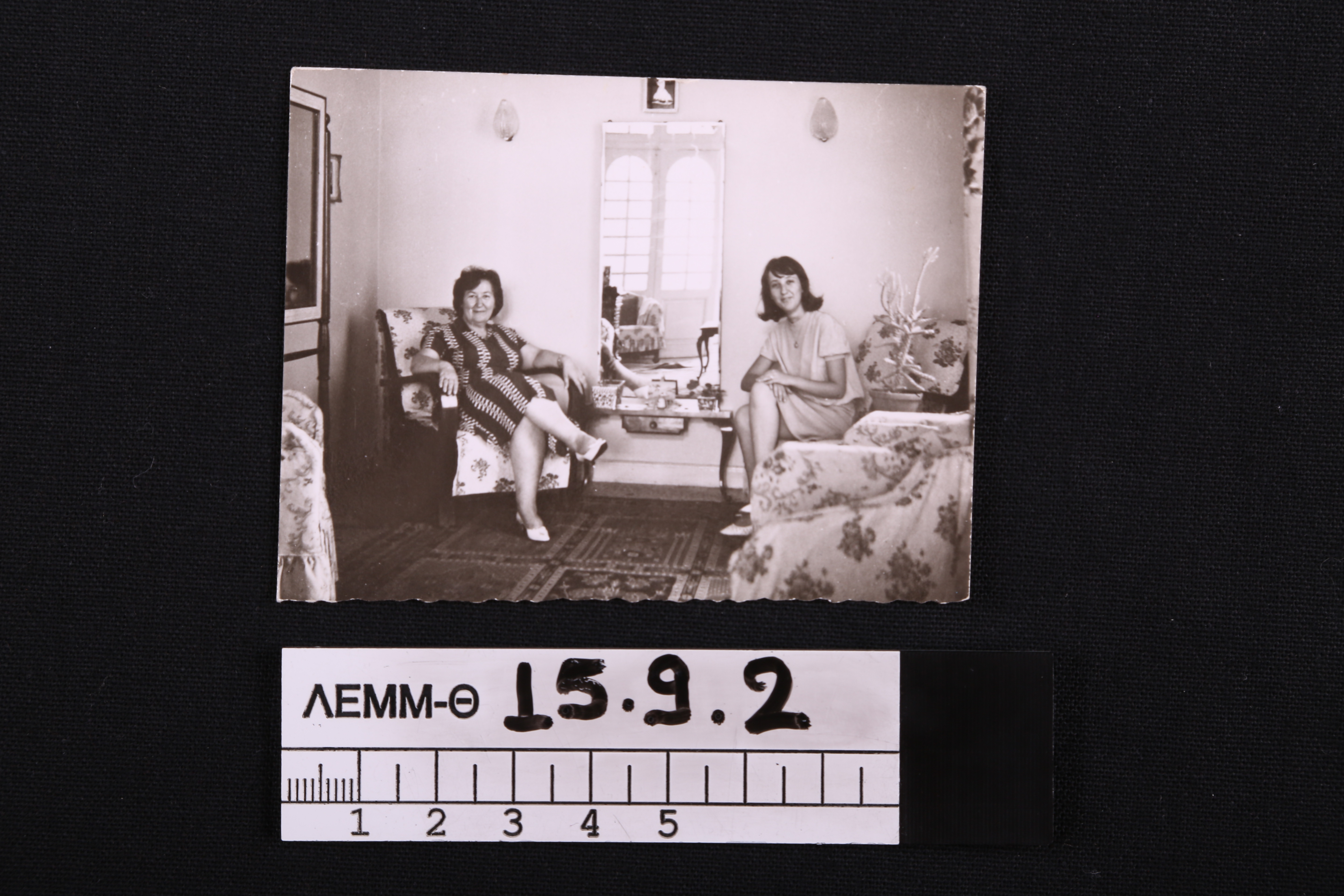 Φωτογραφία - φωτογραφία ασπρόμαυρη που απεικονίζει δύο γυναίκες (τη δωρήτρια Χαρίκλεια Σάκκη και τη μητέρα της Μαρίτσα Σάκκη), οι οποίες ποζάρουν καθήμενες σε σαλόνι κατοικίας, φορώντας ρούχα της δεκαετίας του 1960
