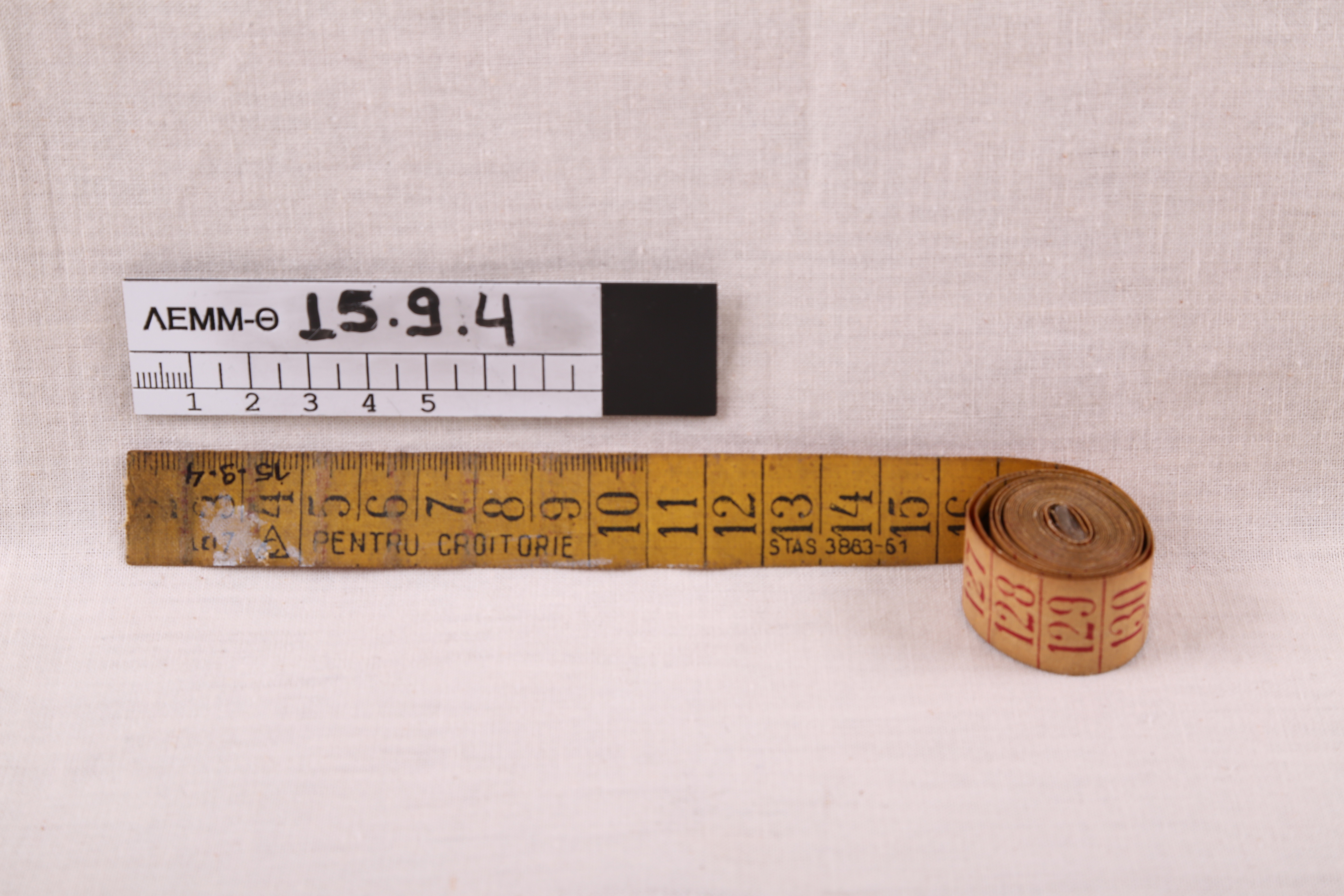Μεζούρα ραπτικής - μεζούρα ραπτικής υφασμάτινη, πλαστικοποιημένη, κίτρινη από τη μία όψη και σομόν από την άλλη, με επιγραφή "PENTRU CROITORIE"