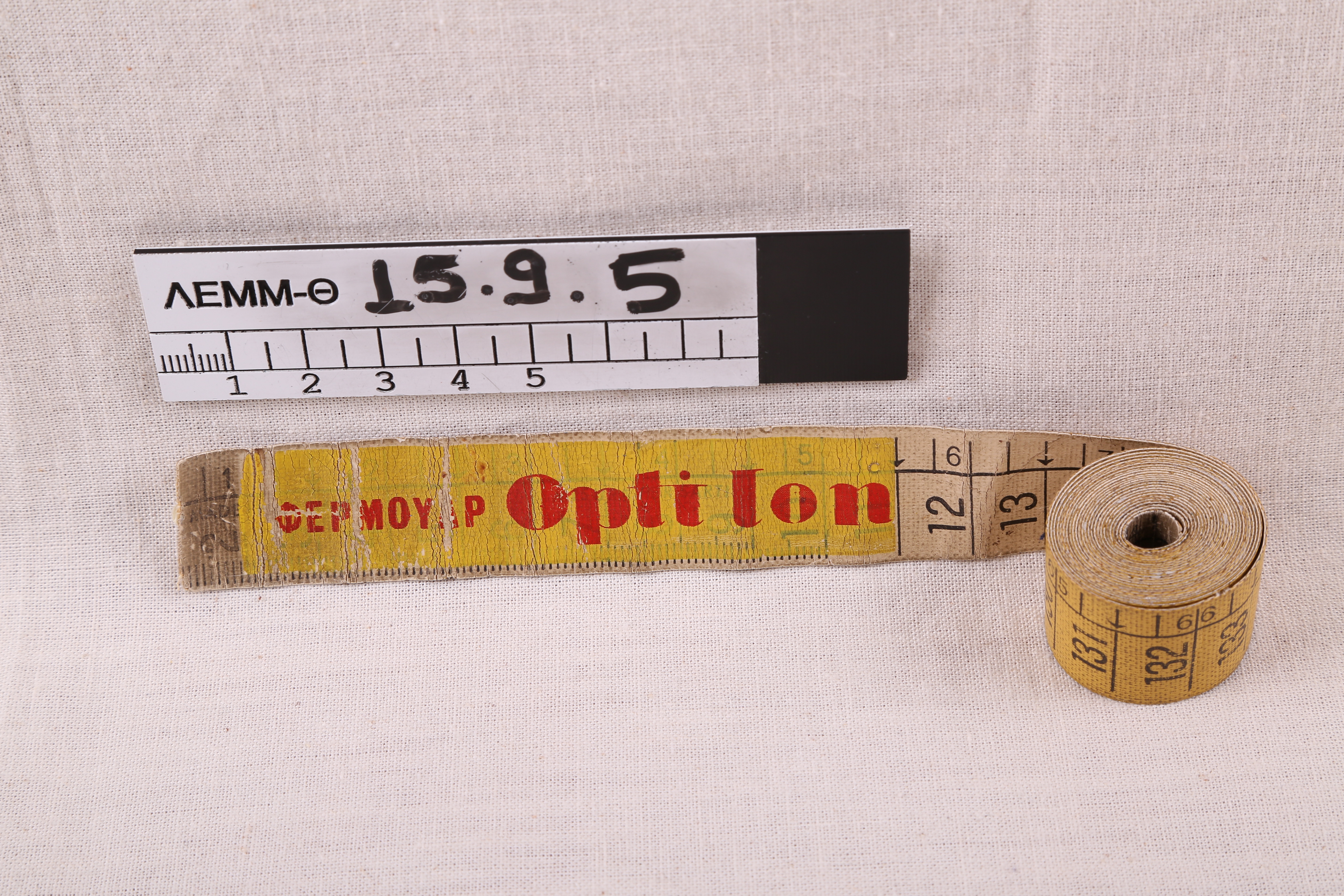 Μεζούρα ραπτικής - μεζούρα ραπτικής υφασμάτινη, πλαστικοποιημένη, κίτρινη από τη μία όψη και εκρού από την άλλη, με επιγραφή "φερμουάρ Optilon"