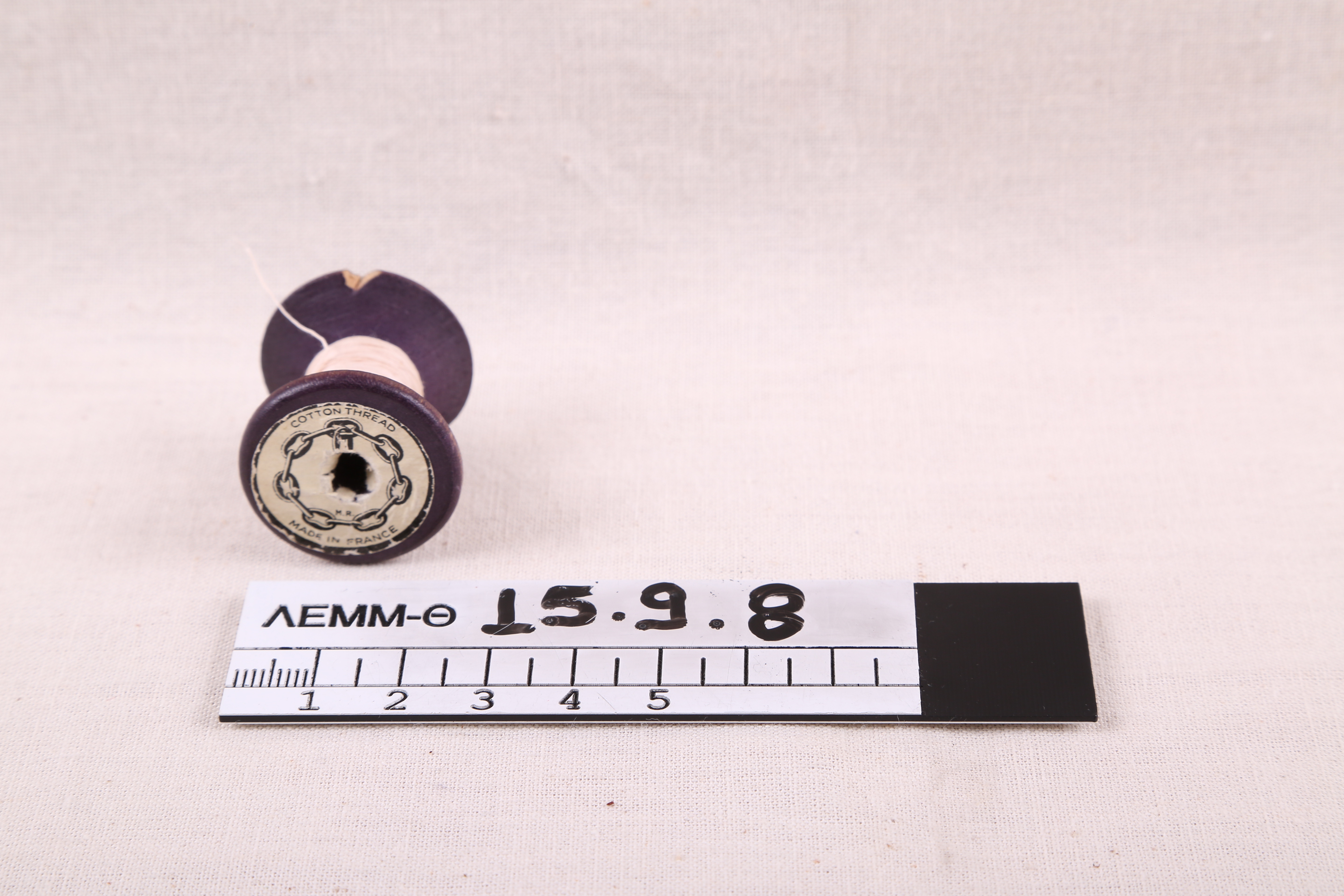 Καρούλι με νήμα - καρούλι ξύλινο μαύρο, με νήμα βαμβακερό υπόλευκο και ετικέτα που απεικονίζει μία αλυσίδα