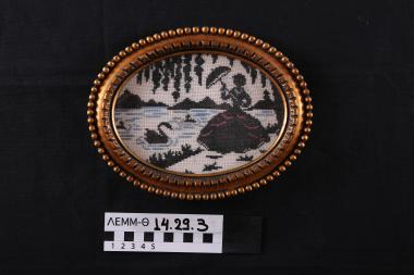 Κέντημα σε κορνίζα - κέντημα με παράσταση γυναίκας με φόρεμα και ομπρέλα, στην όχθη λίμνης με κύκνους. Σε κορνίζα ξύλινη χρυσαφί οβάλ