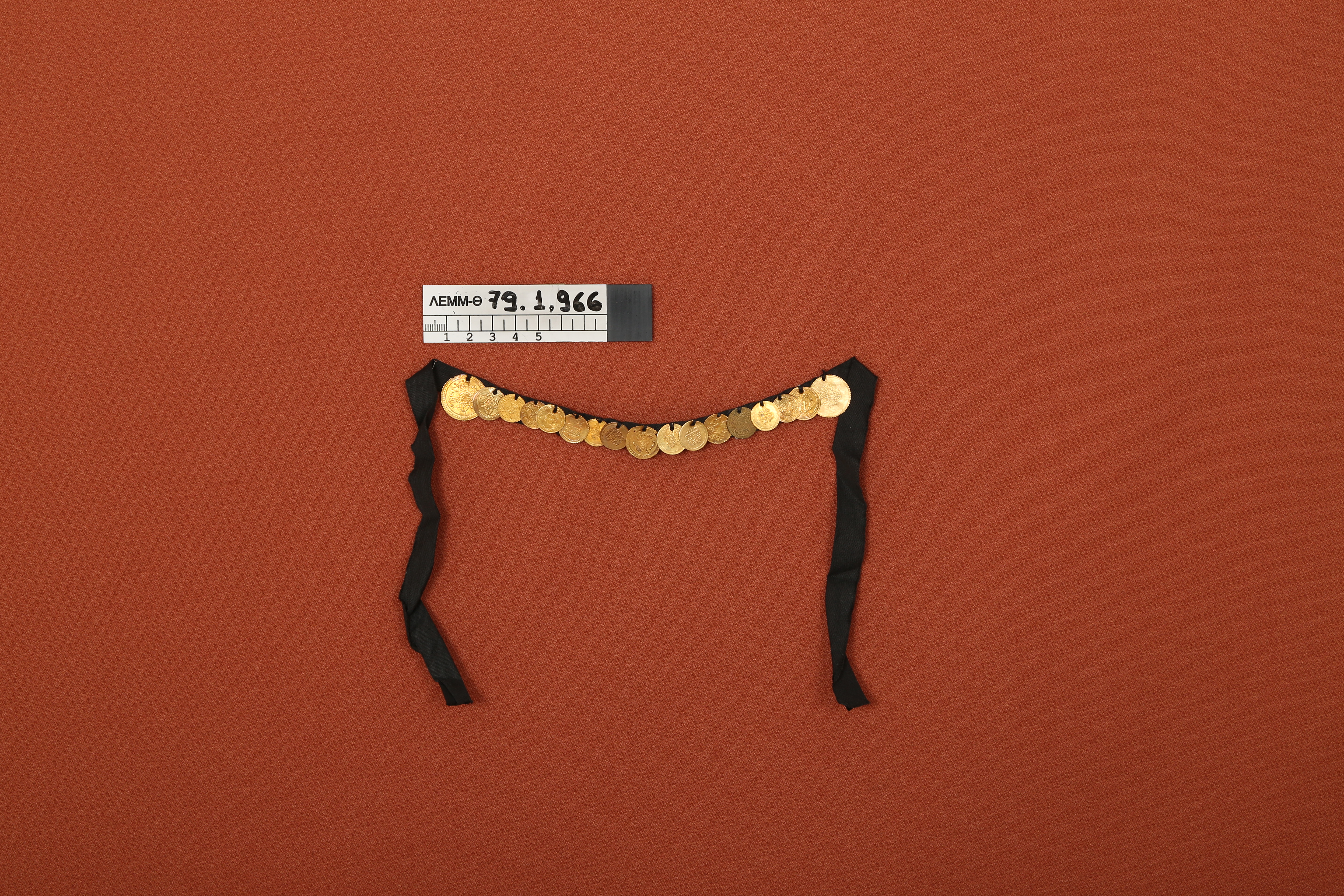 Κόσμημα με φλουριά - νομίσματα οθωμανικά (17), χάλκινα, επίρραπτα κατά μήκος σε ταινία βαμβακερή μαύρη, μακρόστενη