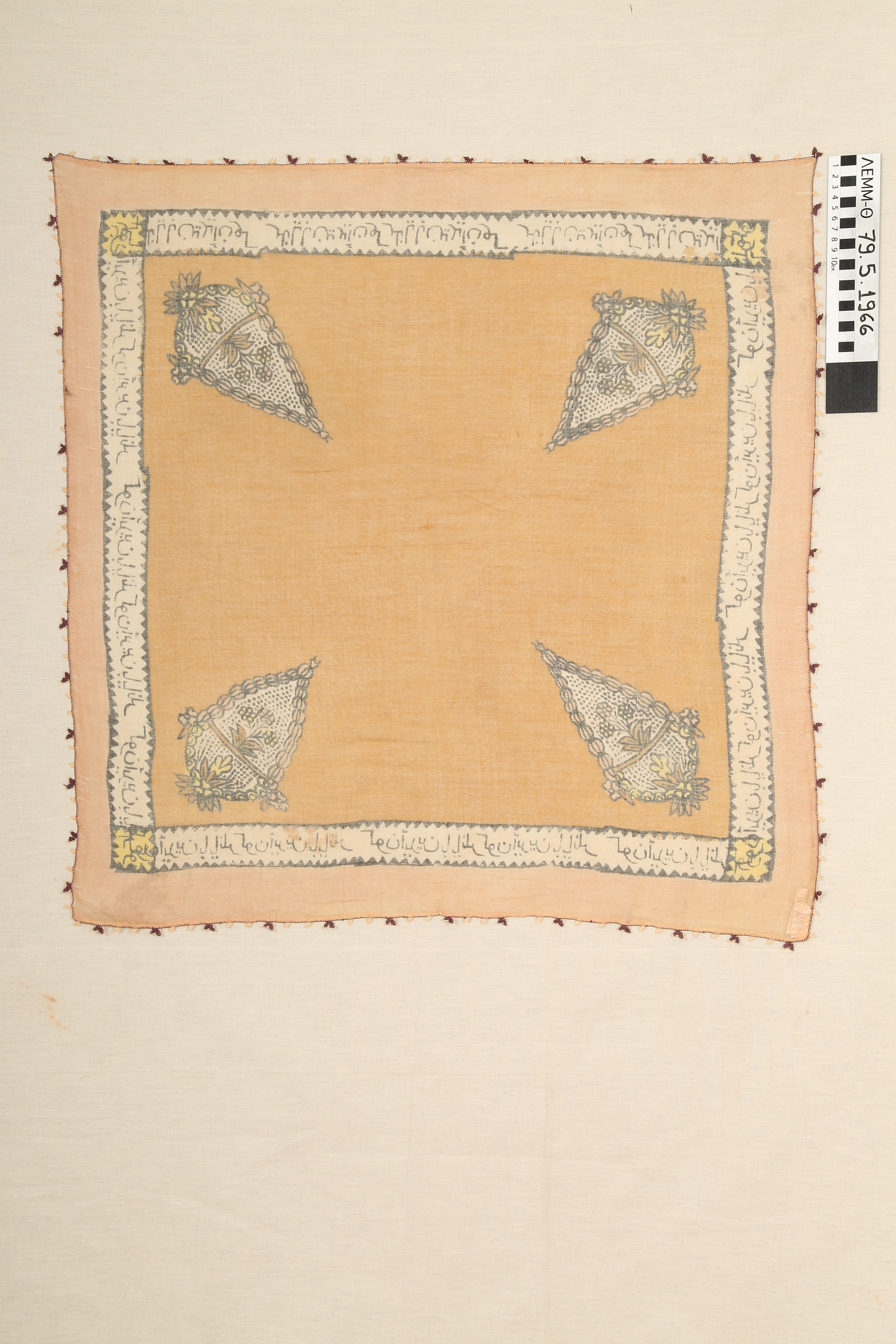 Μαντήλα - μαντήλα από ύφασμα βαμβακερό λεπτό διαφανές (γάζα), σταμπωτή, χρώματος καφέ-κίτρινου, με διακόσμηση μοτίβου καλαθιού με λουλούδια στις τέσσερεις γωνίες και μιας περιμετρικής ζώνης με οθωμαντική γραφή. Περιμετρικά φέρει μπιμπίλα χρώματος μωβ και