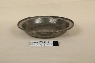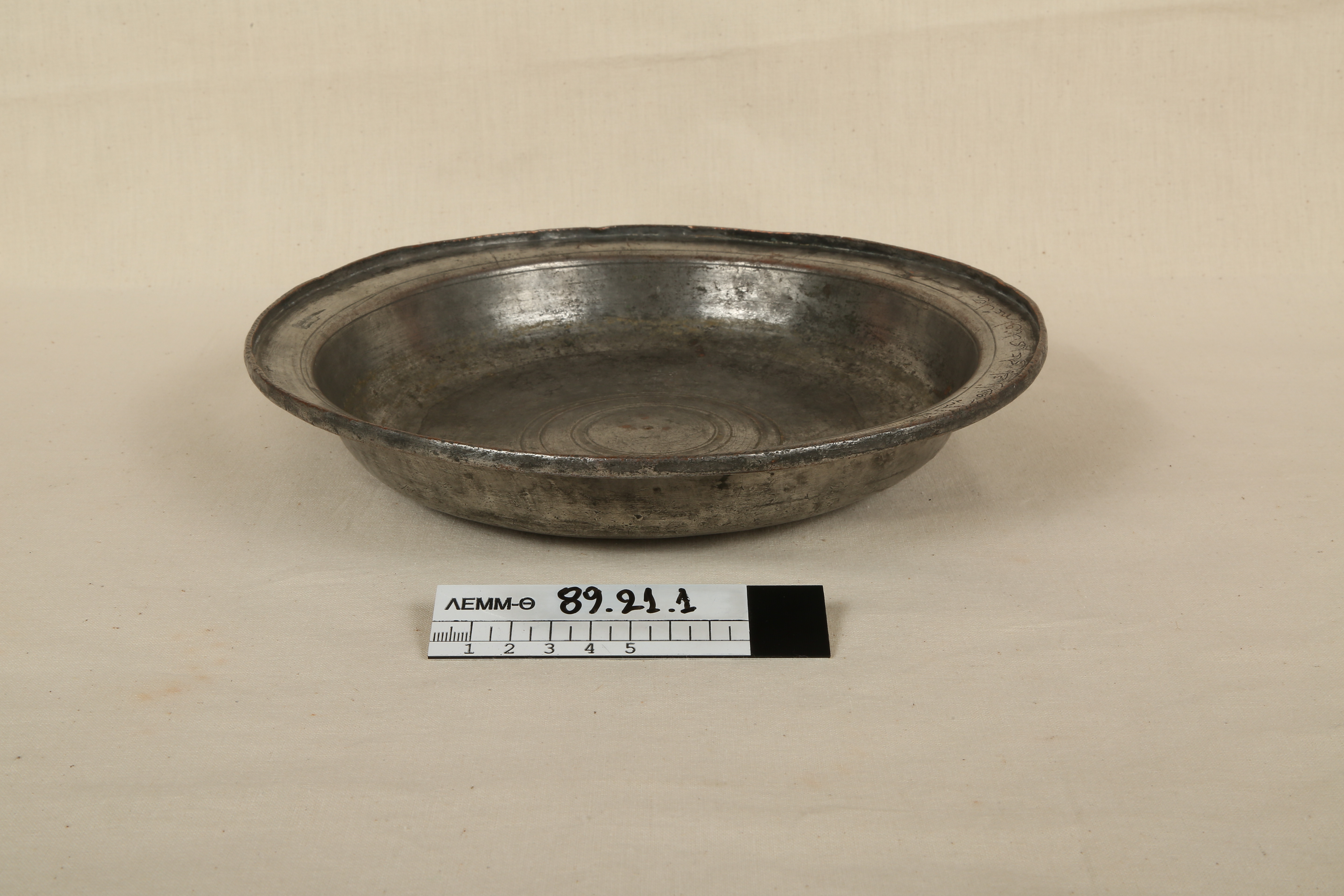 Πιάτο - πιάτο από μπρούντζο και μολύβι, χυτό, γανωμένο βαθύ, με οριζόντιο χείλος, όπου φέρει εγχάρακτα αρχικά "ΑΚ", σφραγίδα τουρκική και εγχάρακτη οθωμανική επιγραφή