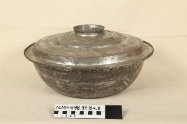 σκεύος (α) χάλκινο σφυρήλατο, γανωμένο (μέσα-έξω), κυκλικού σχήματος, βαθύ, με επίπεδη βάση, τοιχώματα ανοιχτά (σχηματίζουν αμβλεία γωνία με τον πάτο) και χείλος με πατούρα. Ύψος χωρίς το καπάκι 11.5εκ. και διάμετρος 36εκ. Φέρει εγχάρακτη διακόσμηση ομόκεντρων κύκλων εξωτερικά στα τοιχώματα και στο καπάκι. Το καπάκι (β) κωνικό, διαμέτρου 35.5εκ. και ύψος 6.5εκ (με τη λαβή), με 3 επάλληλα επίπεδα που καταλήγουν σε λαβή κυκλική στην κορυφή, διαμέτρου 9εκ και ύψους 1.5εκ. Συνολικό ύψος σκεύους με το καπάκι 17ε