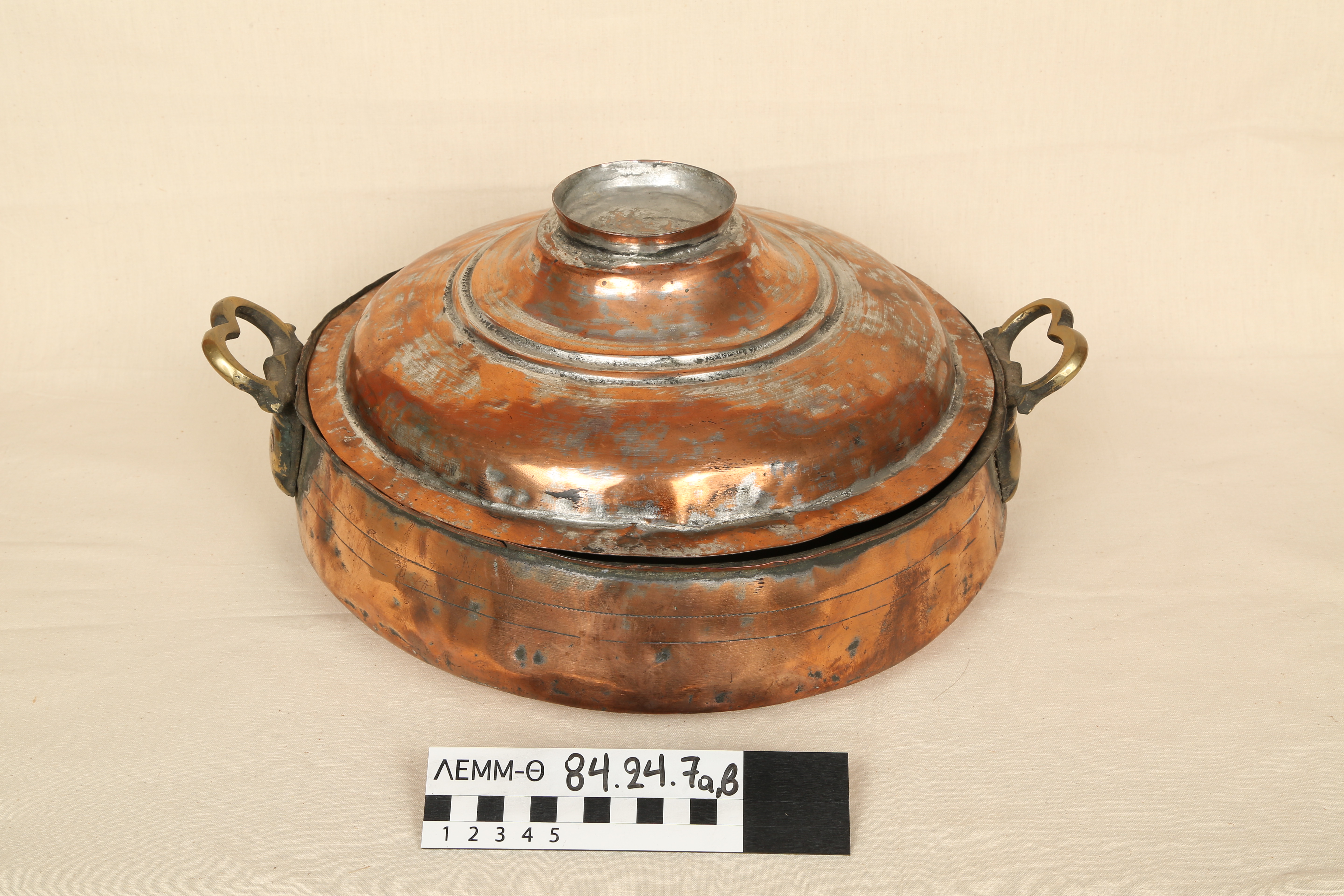 Ταβάς με καπάκι - σκεύος χάλκινο σφυρήλατο, γανωμένο, κυκλικού σχήματος, πλατύ με μέτριο βάθος και δύο χερούλια μπρούντζινα στα τοιχώματα. Φέρει διακόσμηση εγχάρακτη 6 ομόκεντρων κύκλων στο κέντρο της βάσης εσωτερικά, δύο ομόκεντρων κύκλων στην εξωτερική