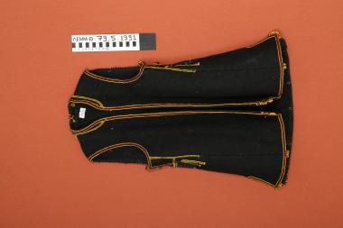 Επενδύτης - επενδύτης παιδικός (για κορίτσι) μάλλινος της νεροτριβής, μαύρος, αμάνικος, με μπροστινό άνοιγμα, πέτα έως κάτω και επίρραπτη διακόσμηση από κορδονέτα μάλλινα κίτρινα, μαύρα και μπορντώ και μεταξωτά μπλε και λευκά