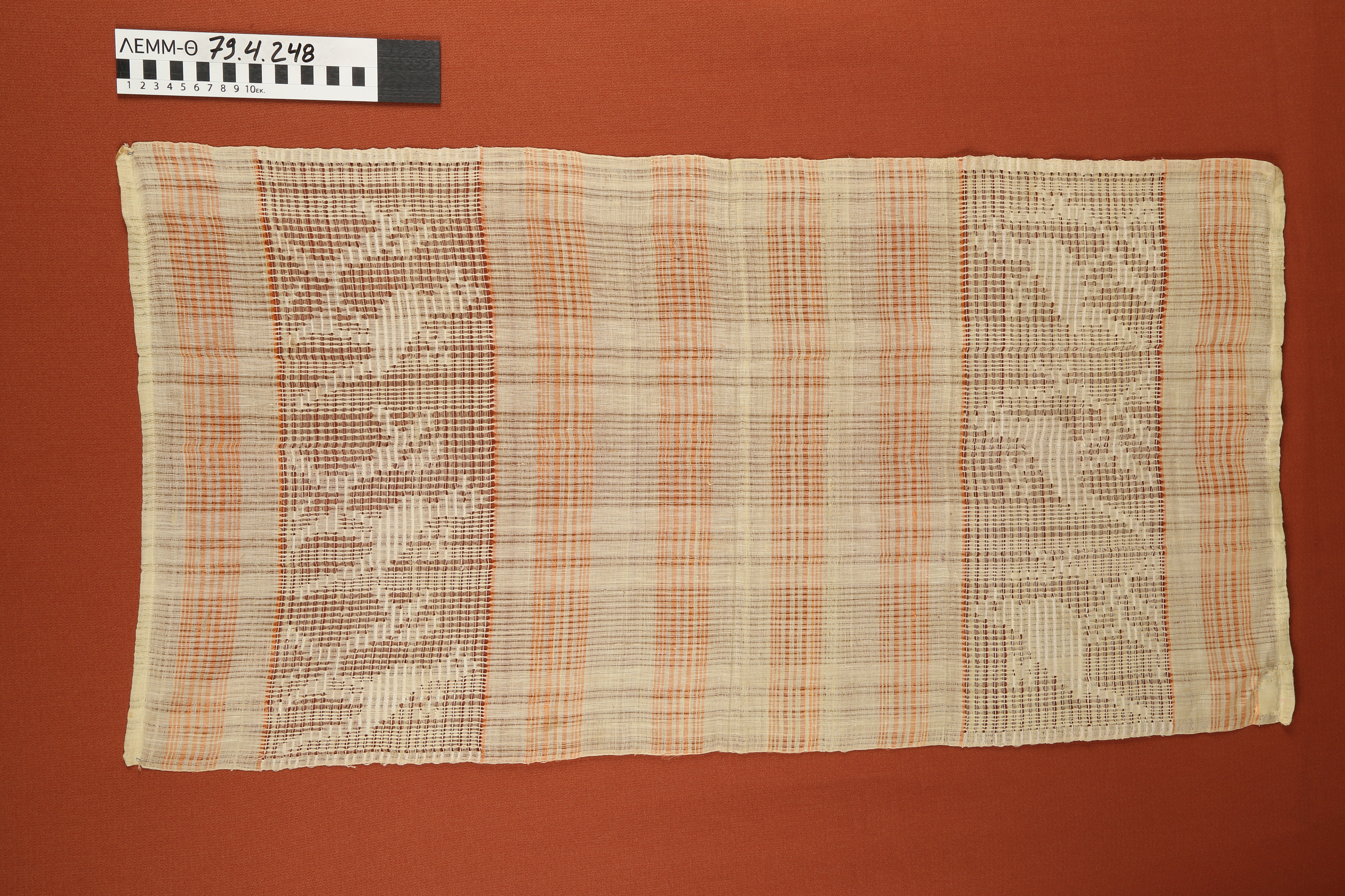 Τσεβρές - τσεβρές μεταξωτός μπεζ με σομόν ρίγες, μακρόστενος, διακοσμημένος στις δύο άκρες με κεντημα αργαλειού, που απεικονίζει τρία πουλιά σε κλωνάρια