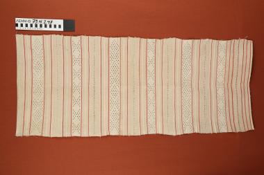 Στρωσίδι - στρωσίδι μεταξωτό μπεζ, με ρίγες παράλληλες κατά πλάτος μπορντώ και εκρού και ενδιάμεσες παράλληλες ταινίες από βαμβακερό νήμα μπεζ, με κοφτό κέντημα