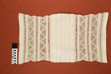 στρωσίδι από βαμβάκι και λινό, υφαντό. Στο κέντρο φέρει εκρού παράλληλες κατά πλάτος ταινίες και στα άκρα κέντημα αργαλειού οργανωμένο σε παράλληλες κατά πλάτος ζώνες που εναλλάσσονται: δύο φαρδιές ζώνες με διάτρητα τριγωνικά μοτίβα και τρεις στενές με στριμμένα χιαστί τα νήματα με τεχνική τύπου αζούρ. Στο ένα άκρο παρατηρείται καφέ κηλίδα (EL)
