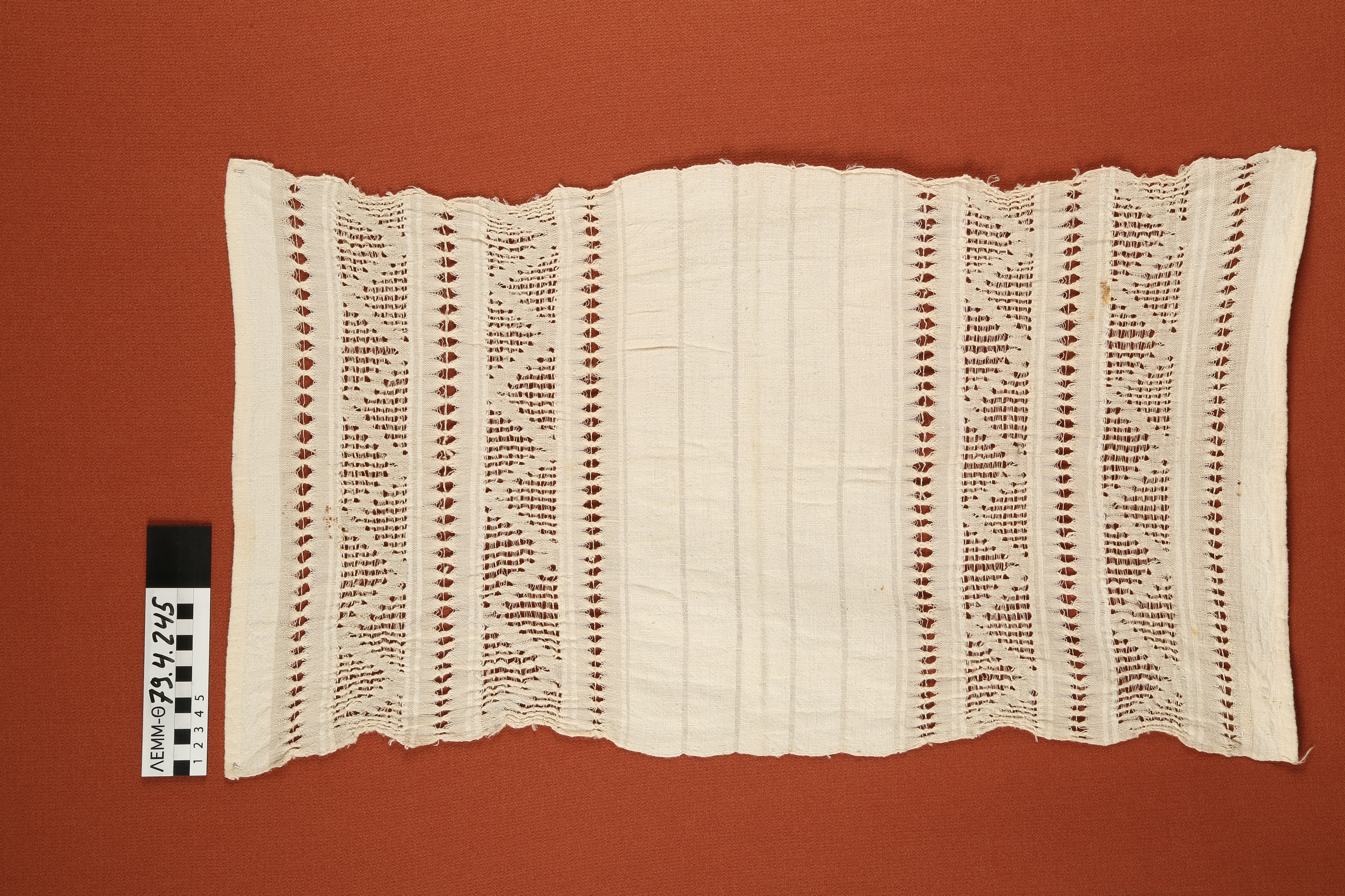 Πετσέτα - στρωσίδι από βαμβάκι και λινό, υφαντό, μπεζ και εκρού, με κέντημα αργαλειού στα άκρα οργανωμένο σε παράλληλες κατά πλάτος ζώνες με τριγωνικά μοτίβα