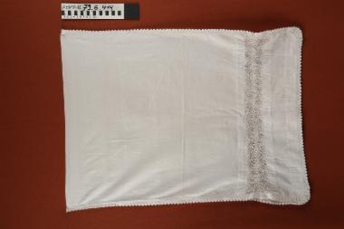 πετσέτα βαμβακερή από χασέ λευκό, με δαντέλα μηχανής βαμβακερή λευκή περιμετρικά και δύο ζώνες στα άκρα κατά πλάτος πλεκτές στη μηχανή με νήμα βαβμακερό λευκό με ρόμβους στο κέντρο με κυματιστό πλαίσιο. Παρατηρείται μία οπή στη μία πλεκτή ζώνη και καφέ κηλίδες στο χασεδένιο ύψασμα