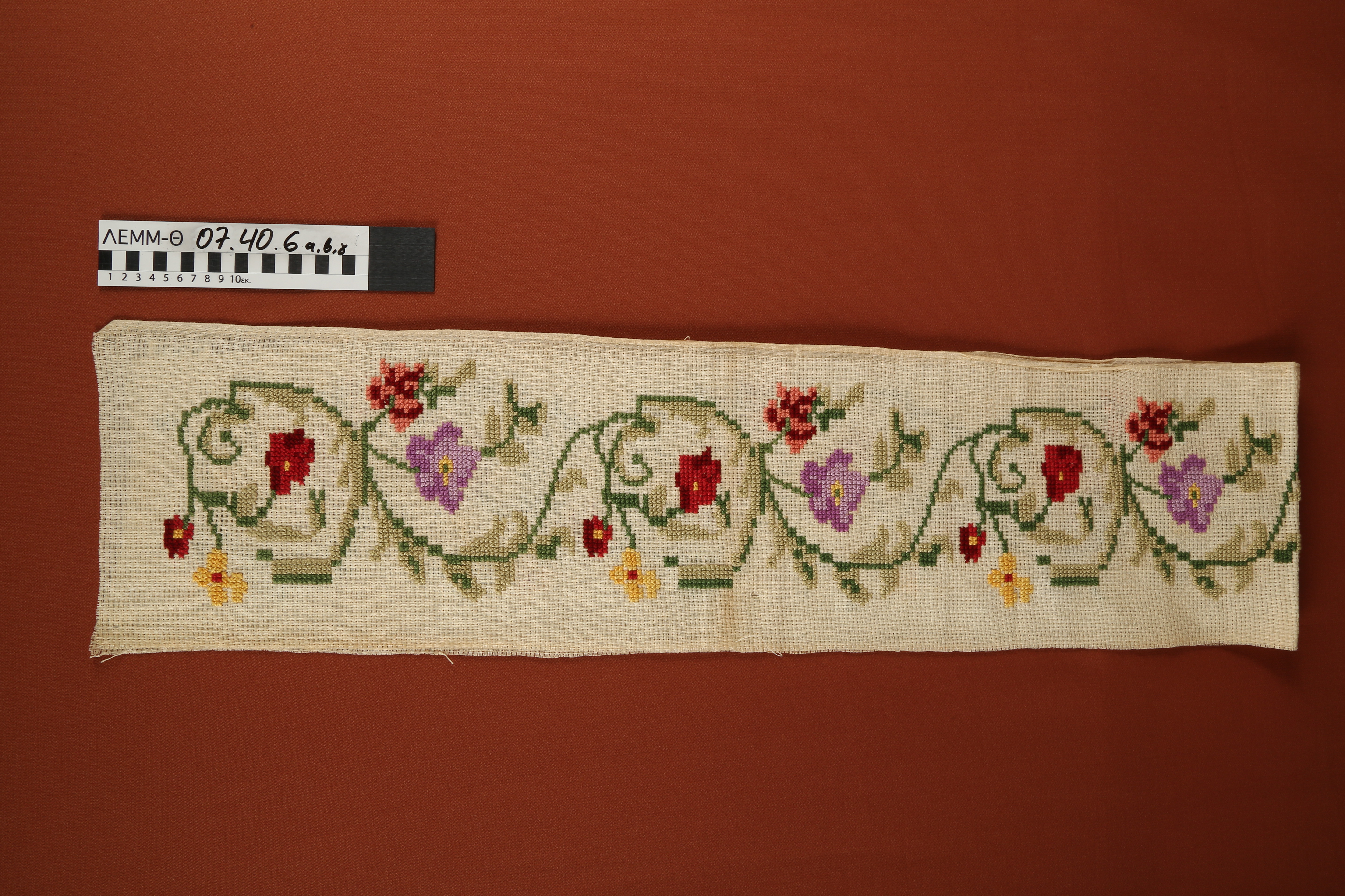 Κρεβατόγυροι - τμήματα (3) καμβά βαμβακερού εκρού, μακρόστενα, με κεντητό διάκοσμο φυτικών μοτίβων