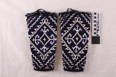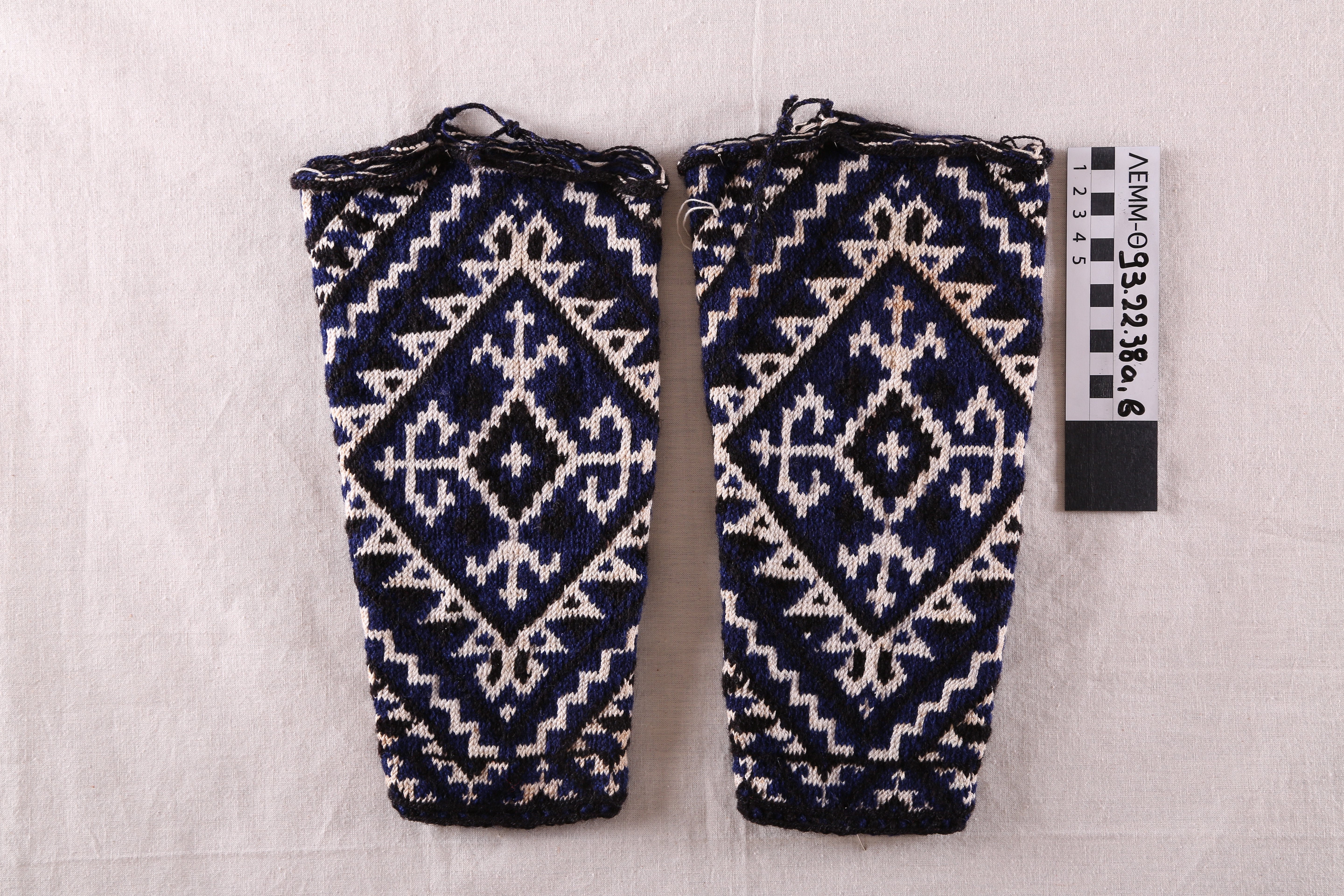 Κάλτσες (ζεύγος) - περικνημίδες μάλλινες πλεκτές σε χρώματα μπλε, μαύρο και λευκό, με γεωμετρικά σχέδια, με κεντρικό μοτίβο ρόμβου που εσωκλείει σταυρόσχημο λευκό μοτίβο και έναν μικρό ρόμβο με σταυρό στο κέντρο. Σαρακατσάνικες