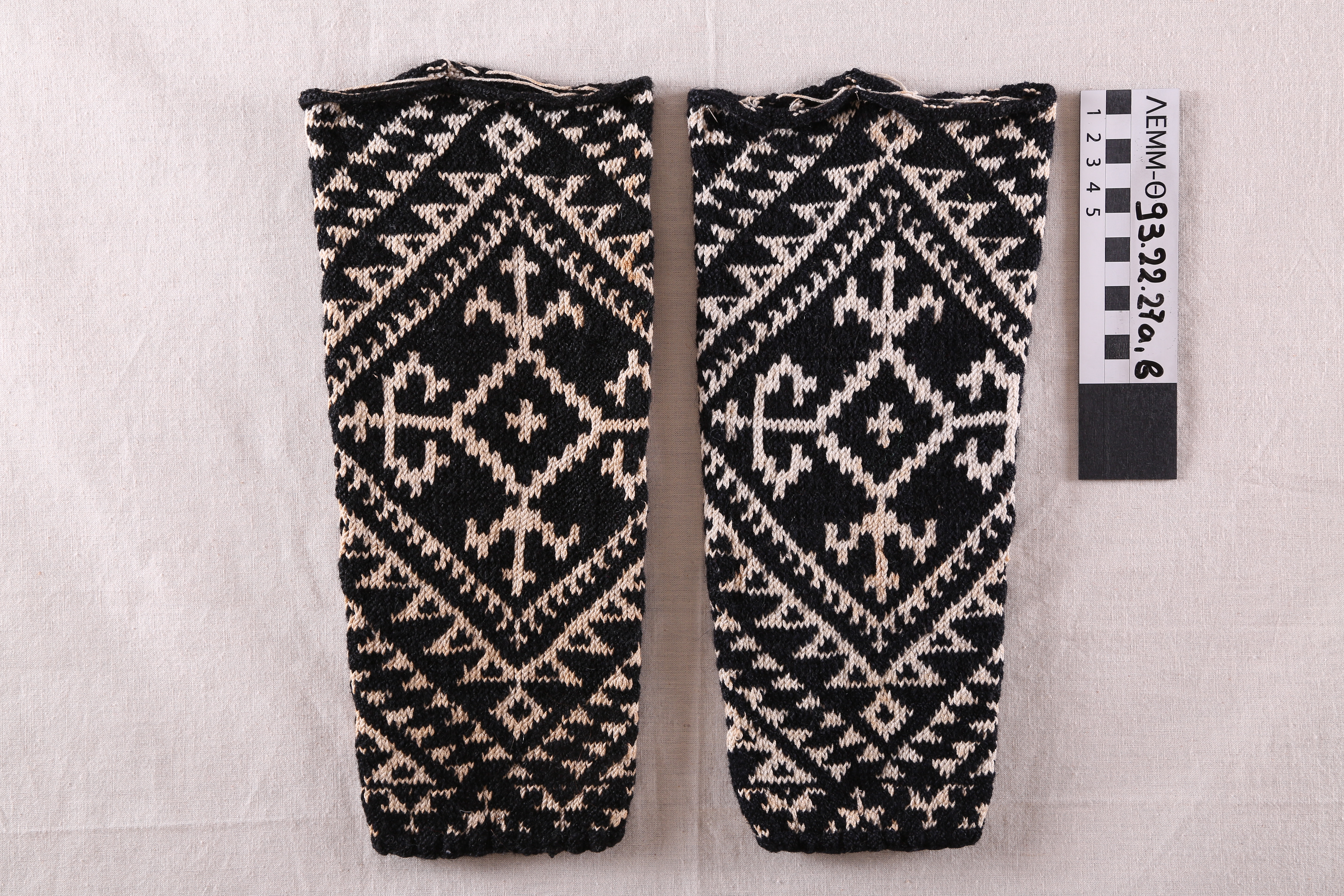 Κάλτσες (ζεύγος) - περικνημίδες μάλλινες πλεκτές σε χρώματα μαύρο και λευκό, με γεωμετρικά σχέδια, με κεντρικό μοτίβο ρόμβου που εσωκλείει σταυρόσχημο λευκό μοτίβο και έναν μικρό λευκό ρόμβο με σταυρό στο κέντρο. Σαρακατσάνικες